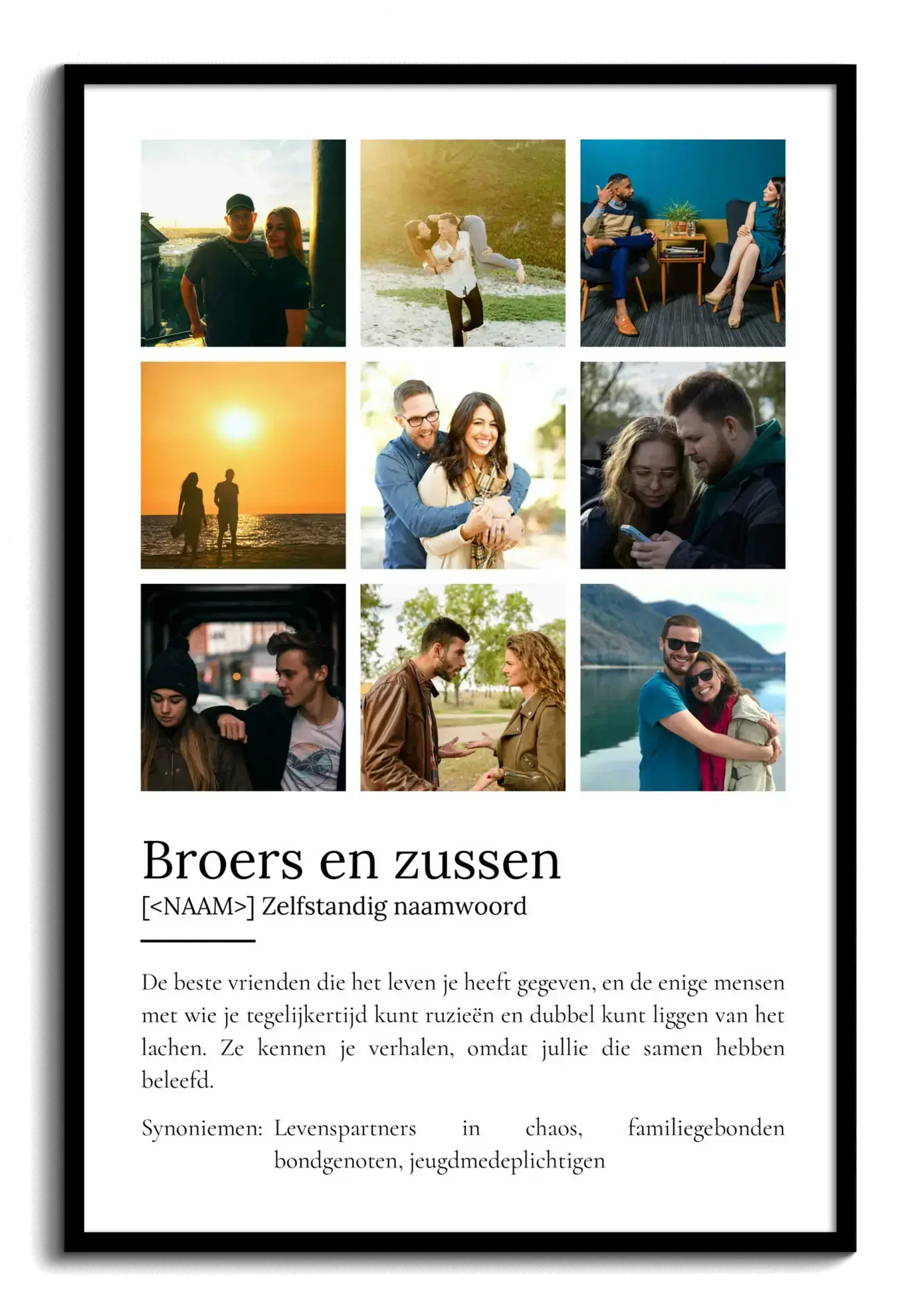 Maak je eigen unieke fotocollage en geef een speciaal cadeau dat persoonlijke betekenis heeft. Dit Definitions-Poster 'Geschwister' in Duden-stijl is perfect voor broers en zussen. Personaliseer het met je eigen foto of tot wel 9 foto's. De tekst definieert broers en zussen als de beste vrienden die het leven je heeft gegeven, en met wie je zowel kunt ruziën als lachen. Pas tekst, kleur, foto's en lay-out geheel naar wens aan.