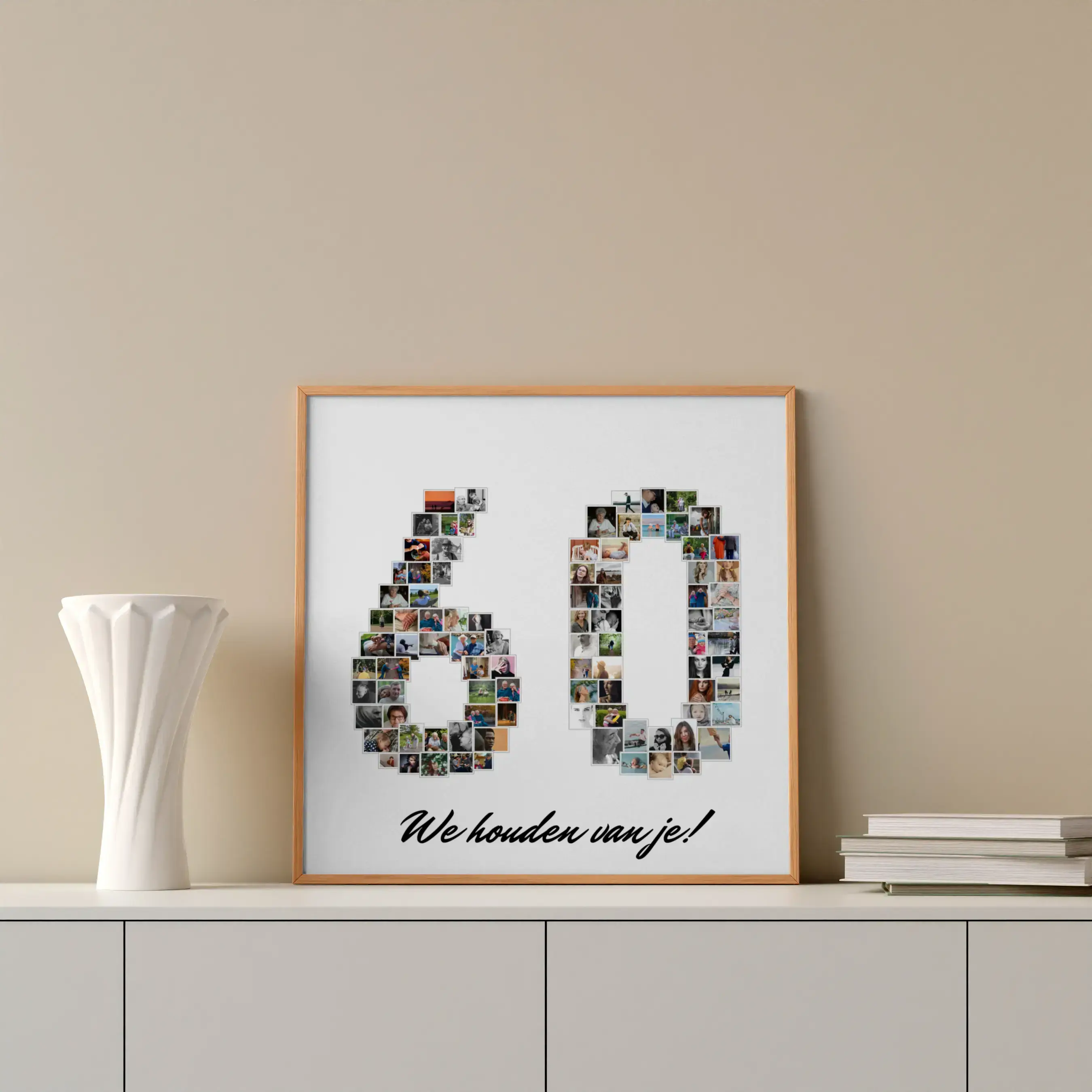 Creëer je eigen unieke fotocollage en breng herinneringen tot leven op een speciale manier. Stel je eens voor: een '60' gevormd uit al jouw favoriete foto's. Ideaal voor een zestigste verjaardag of pensionering. Je kunt kiezen uit 1 tot 100 foto's, afhankelijk van de gekozen sjabloon en cijfers.