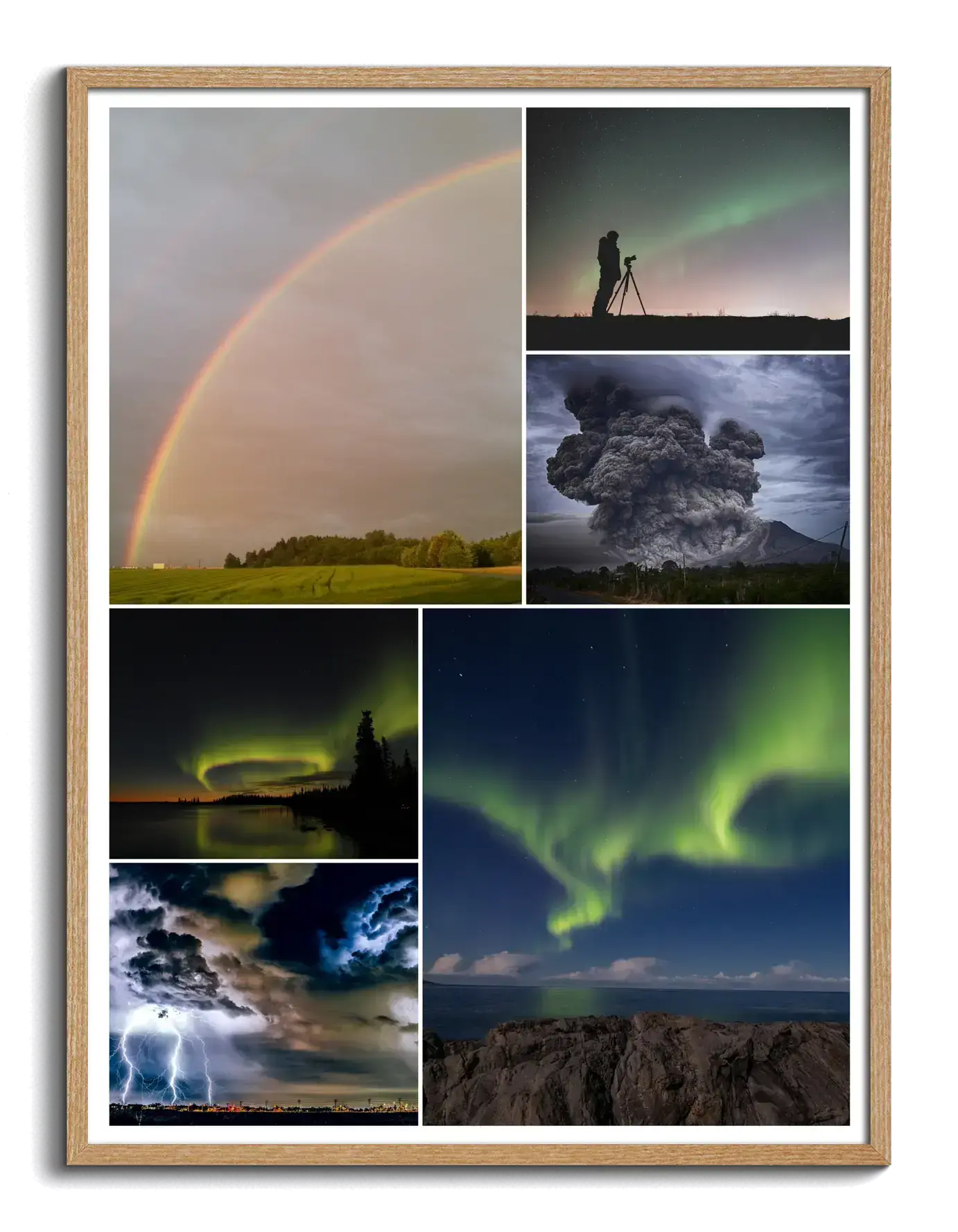 Natuurfenomenen als collage: noorderlicht, watervallen, regenbogen, onweer in premiumdruk