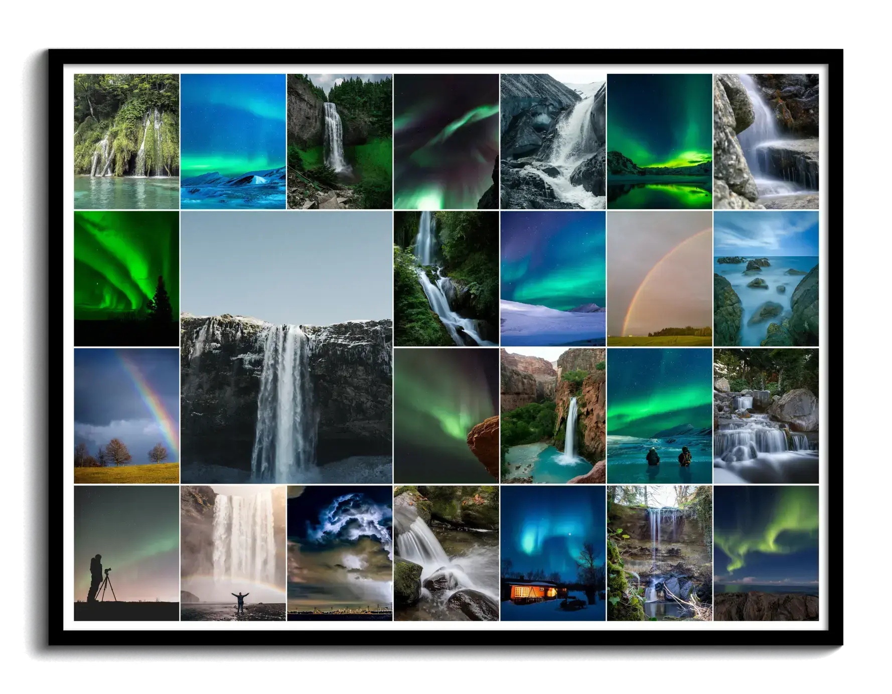 Natuur-fotocollage printen: ontwerp nu jouw premium noorderlicht, watervallen, regenbogen