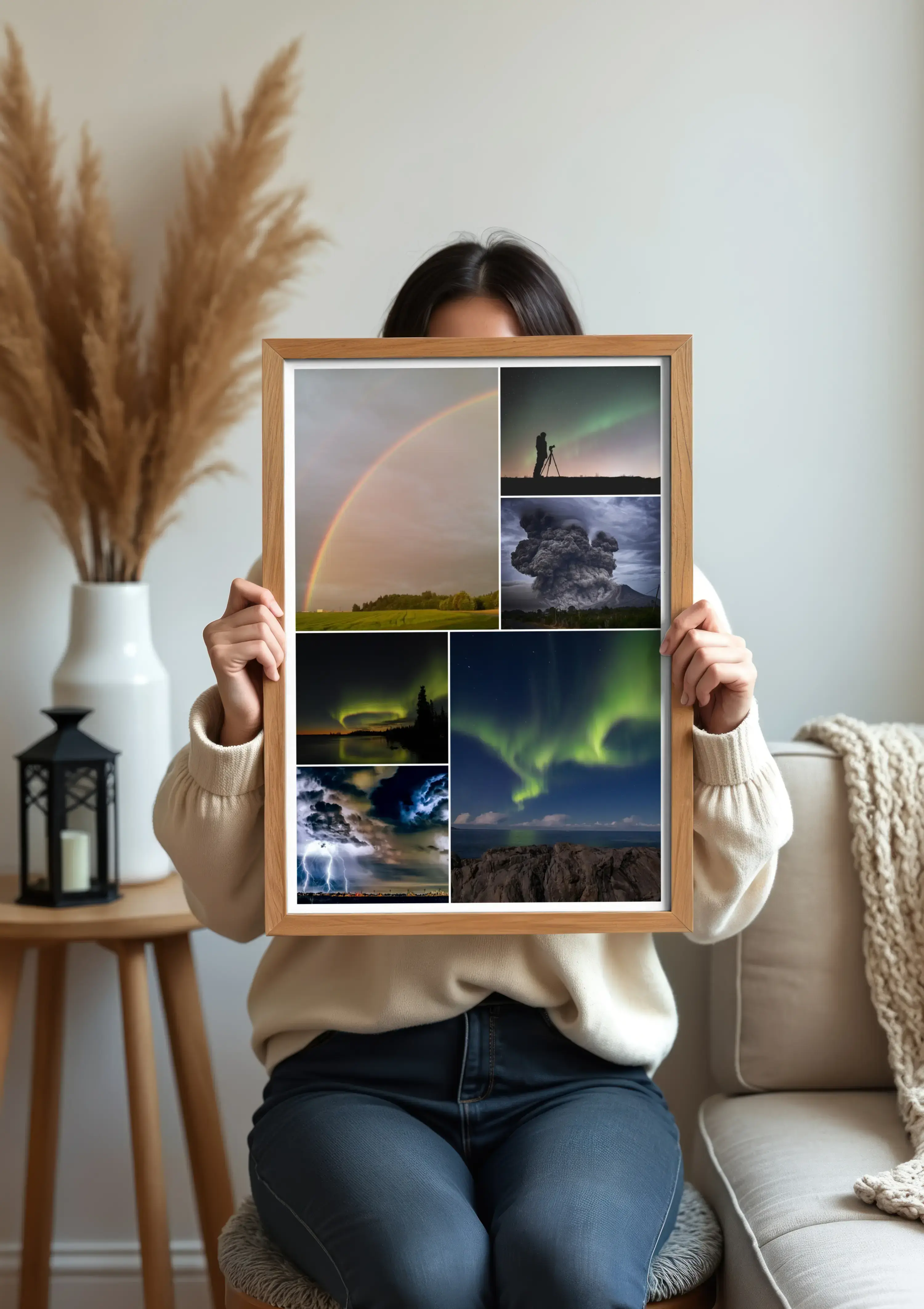 Begin meteen en ontwerp je eigen natuurcollage. In dit voorbeeld staat de kracht van de natuur centraal: dansend noorderlicht boven ruige landschappen, donderende watervallen en rustige rivieren, helder gekleurde regenbogen na zomerse buien en energieke onweersluchten vol bliksem. Premiumdruk en diverse collage‑sjablonen zetten elk detail haarscherp neer.
