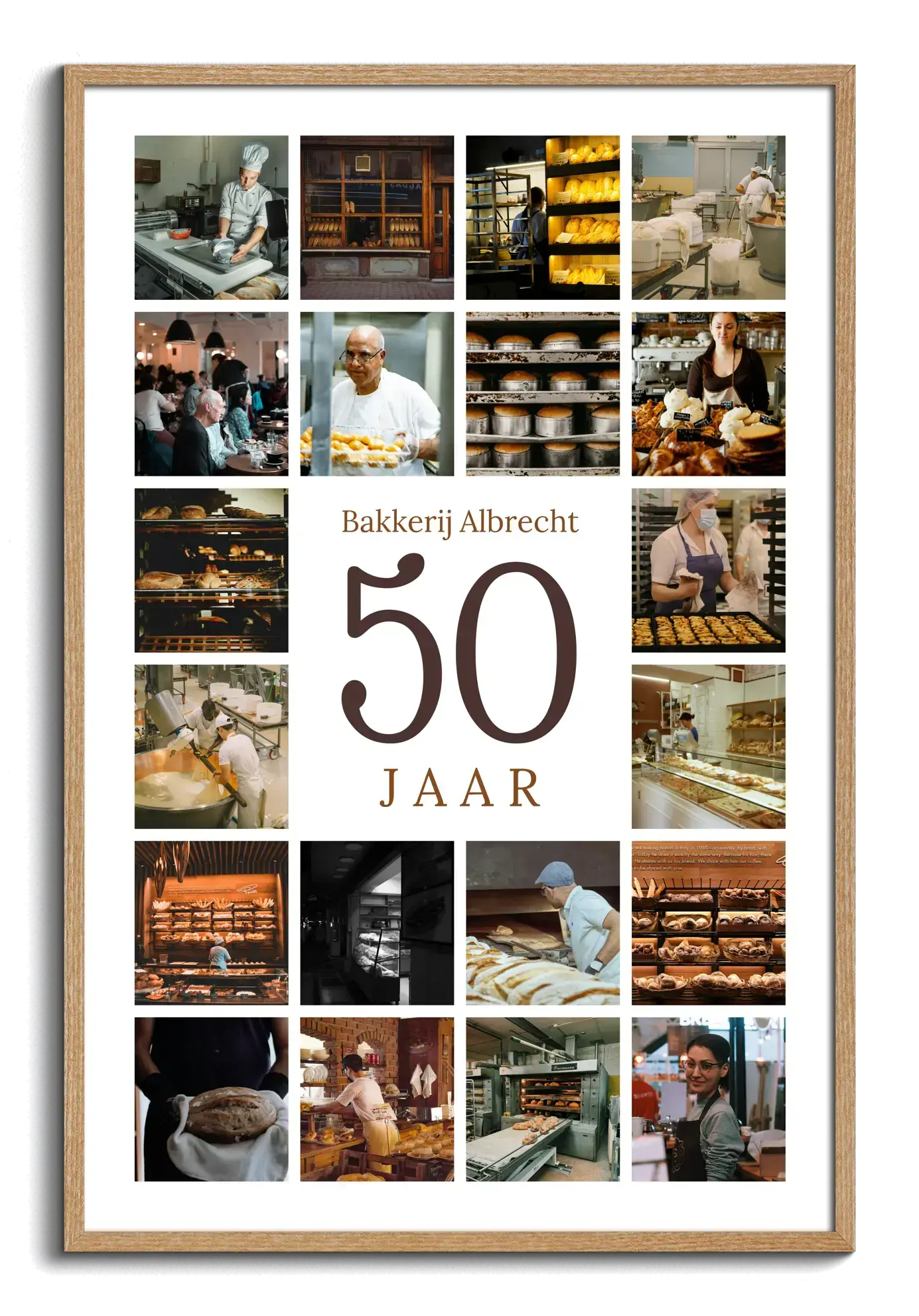 Bestel nu je jubileum-nummercollage voor het 50-jarig bedrijfsjubileum. In het midden staat een grote 50, daarboven plaats je de bedrijfsnaam en eronder een korte jubileum- of danktekst. Het geheel wordt omlijst door 20–80 foto’s in een strak, gelijkmatig raster.