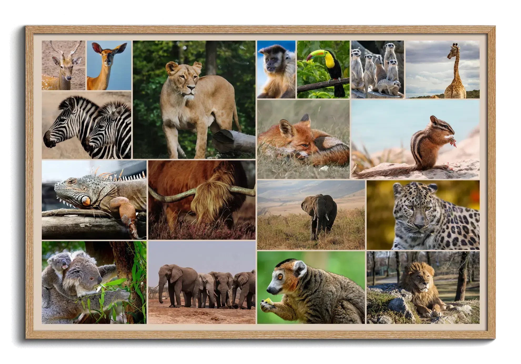 Begin nu met je eigen natuur-collage. Bundel dierenmomenten uit bos en savanne: herten, vossen, egels, vlinders en beren; vogels als adelaars, uilen, flamingo’s, pauwen en kolibries; plus leeuwen, zebra’s, giraffen, olifanten, luipaarden, apen, lemuren en hagedissen. Premium geprint.