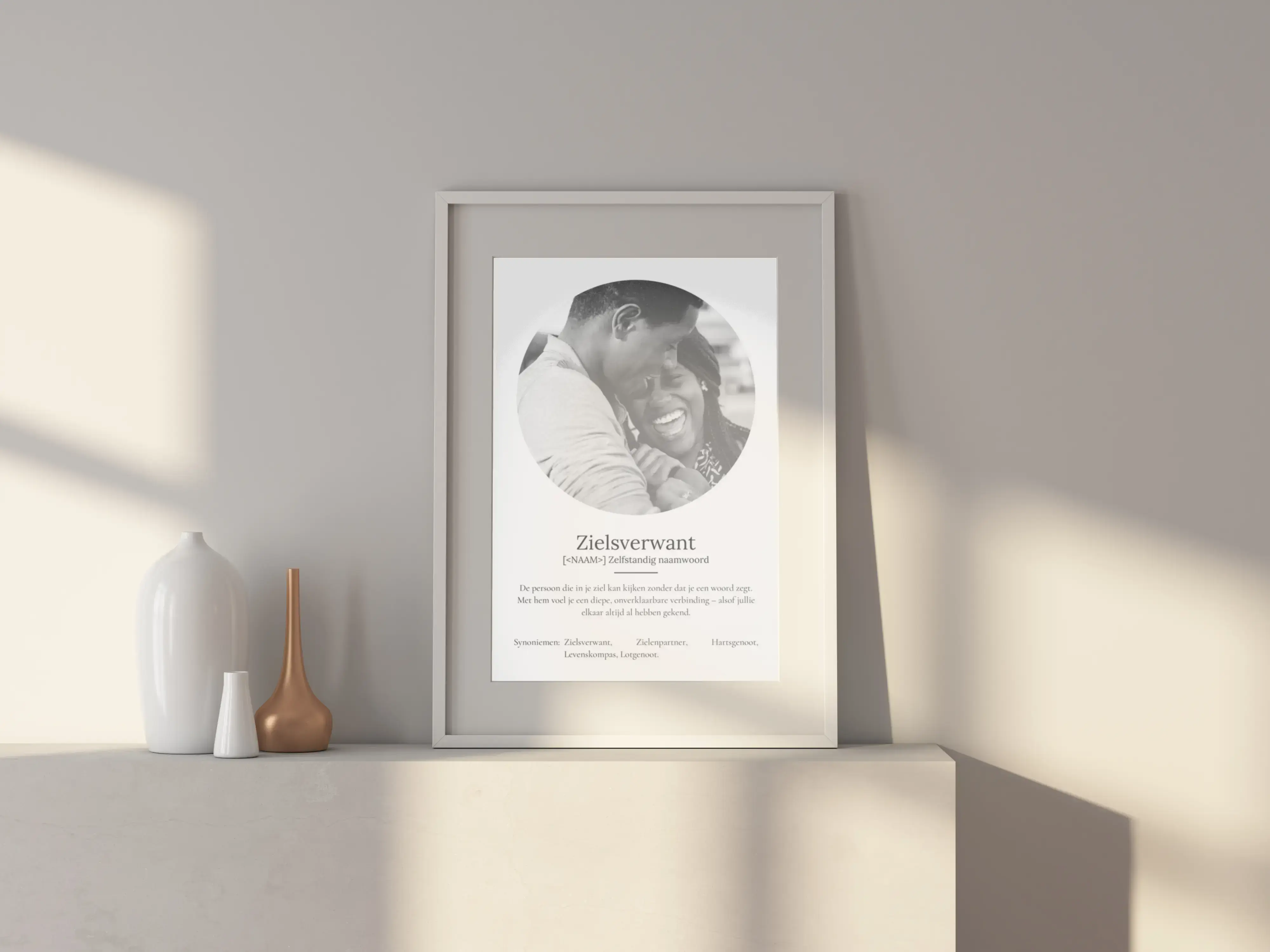 Breng je speciale momenten tot leven met onze gepersonaliseerde fotocollages. Stel je voor dat je jouw unieke 'Soulmate'-poster creëert in de stijl van een Duden-definitie. Voeg een persoonlijke foto toe, of zelfs tot negen, en maak een blijvend cadeau met de meegeleverde tekst: 'De persoon die in je ziel kan kijken zonder een woord te zeggen. Met hem voel je je verbonden op een diep, onverklaarbaar niveau – alsof jullie elkaar altijd al gekend hebben.' Personaliseer tekst, kleur, foto's en layout om het definitief uniek te maken.