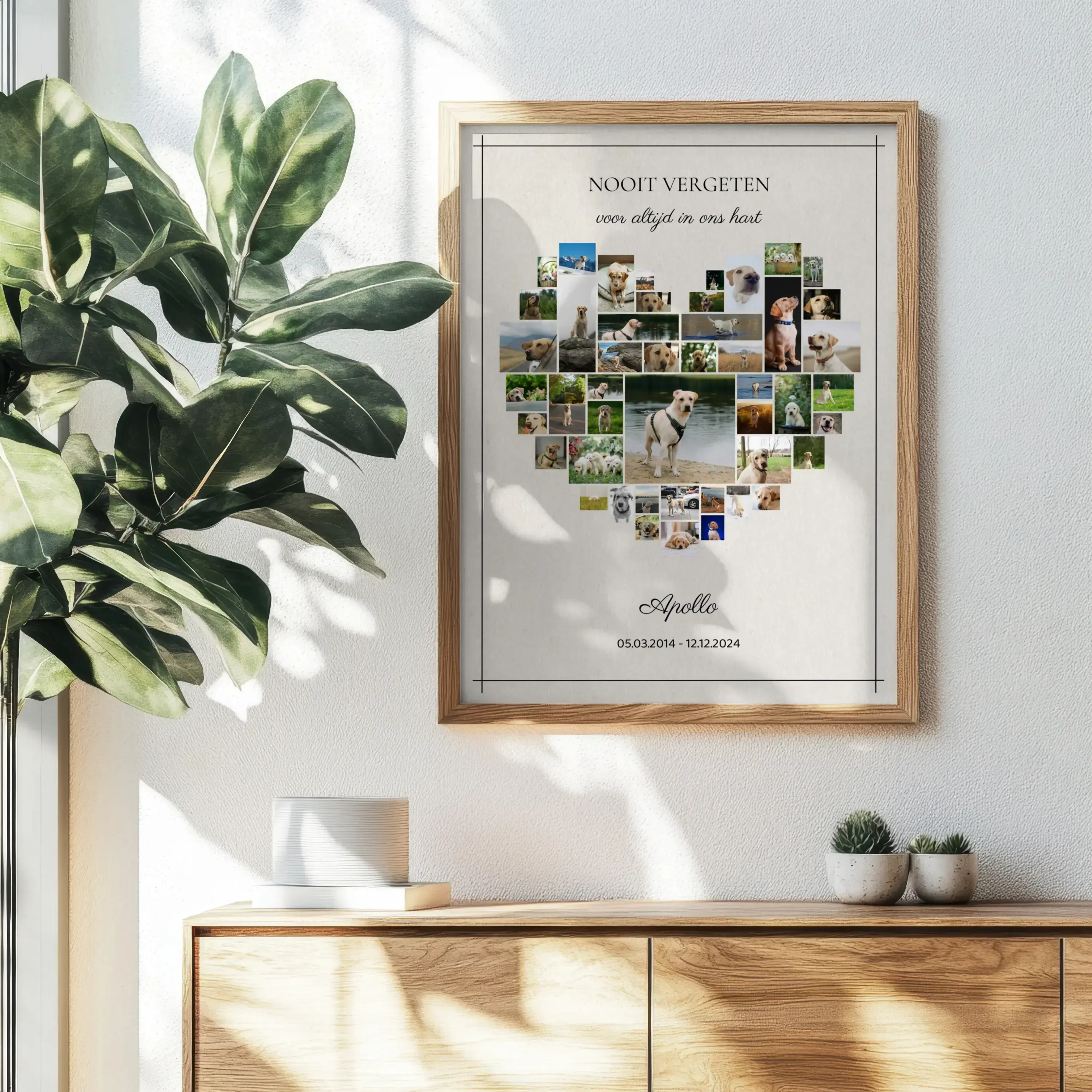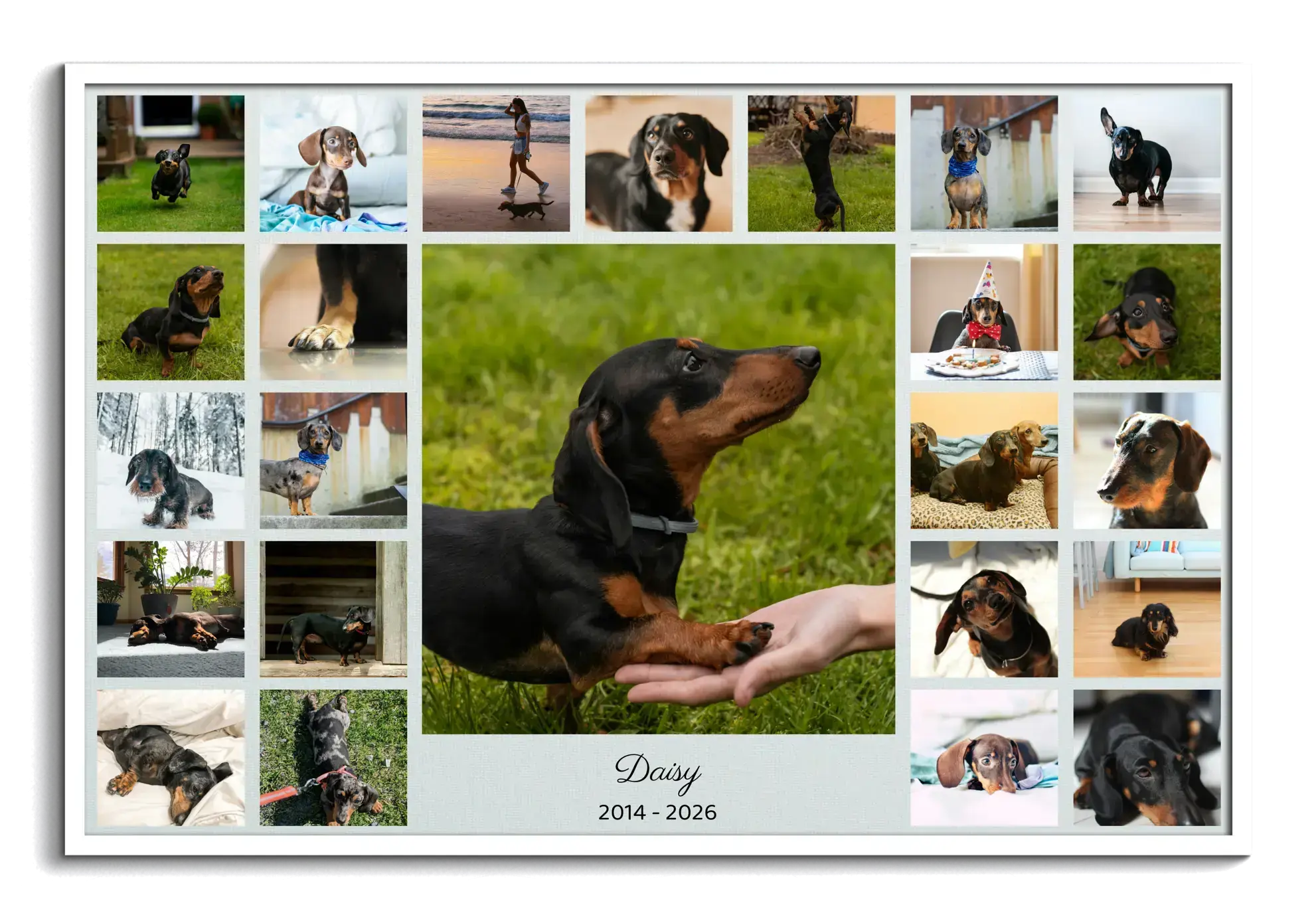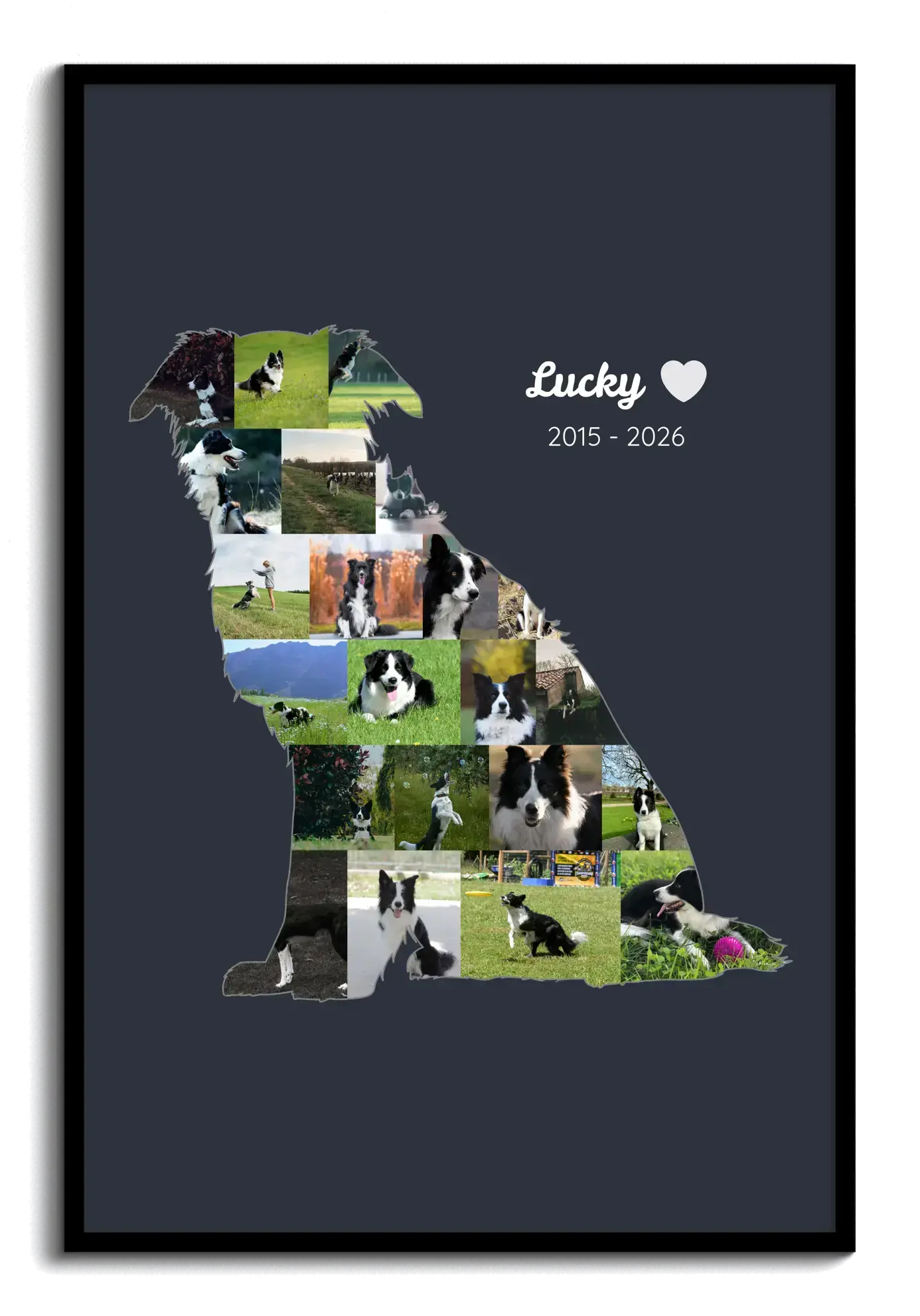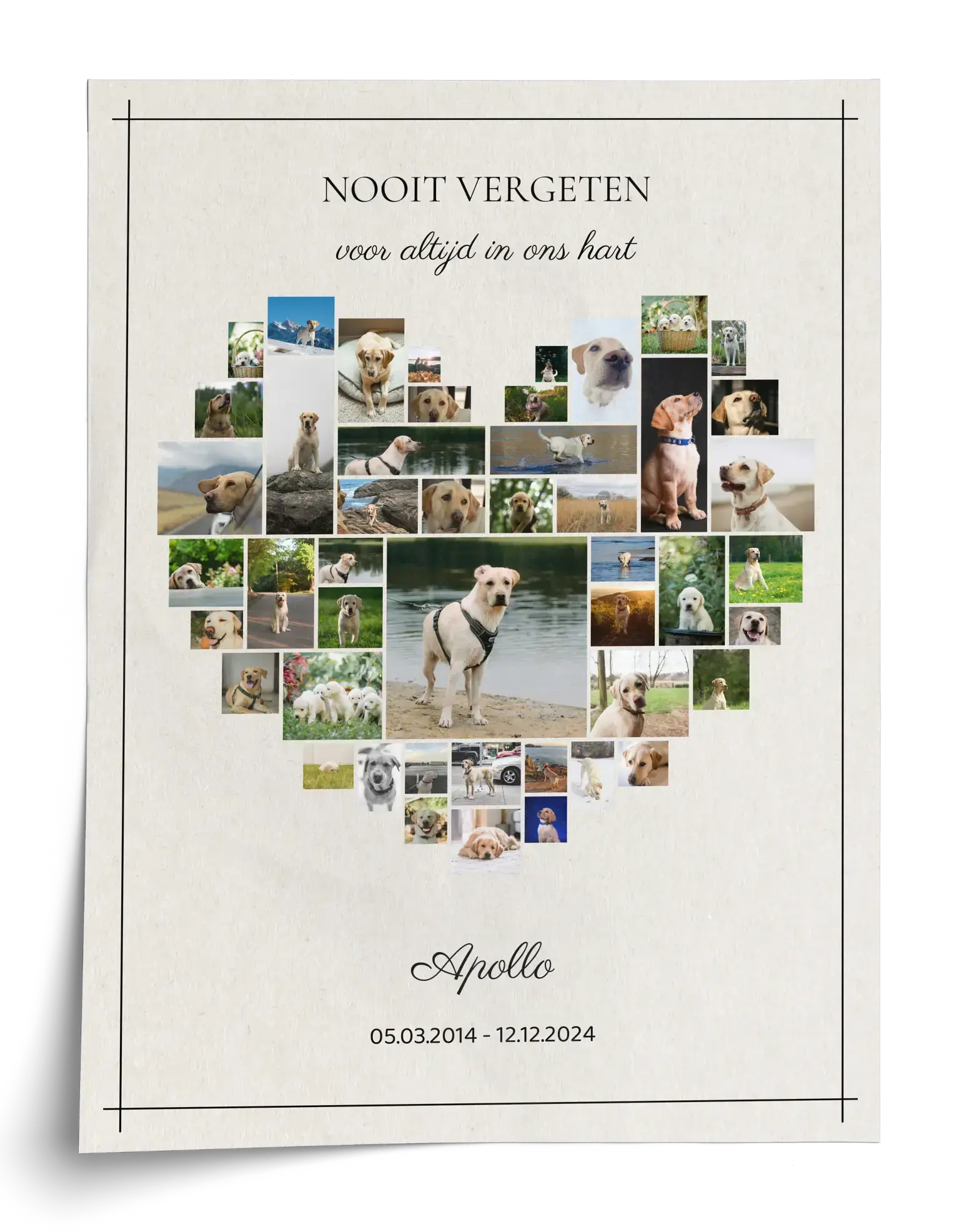 Hondensilhouet-collage ter herinnering: gevuld met foto's, naam en levensjaren.
