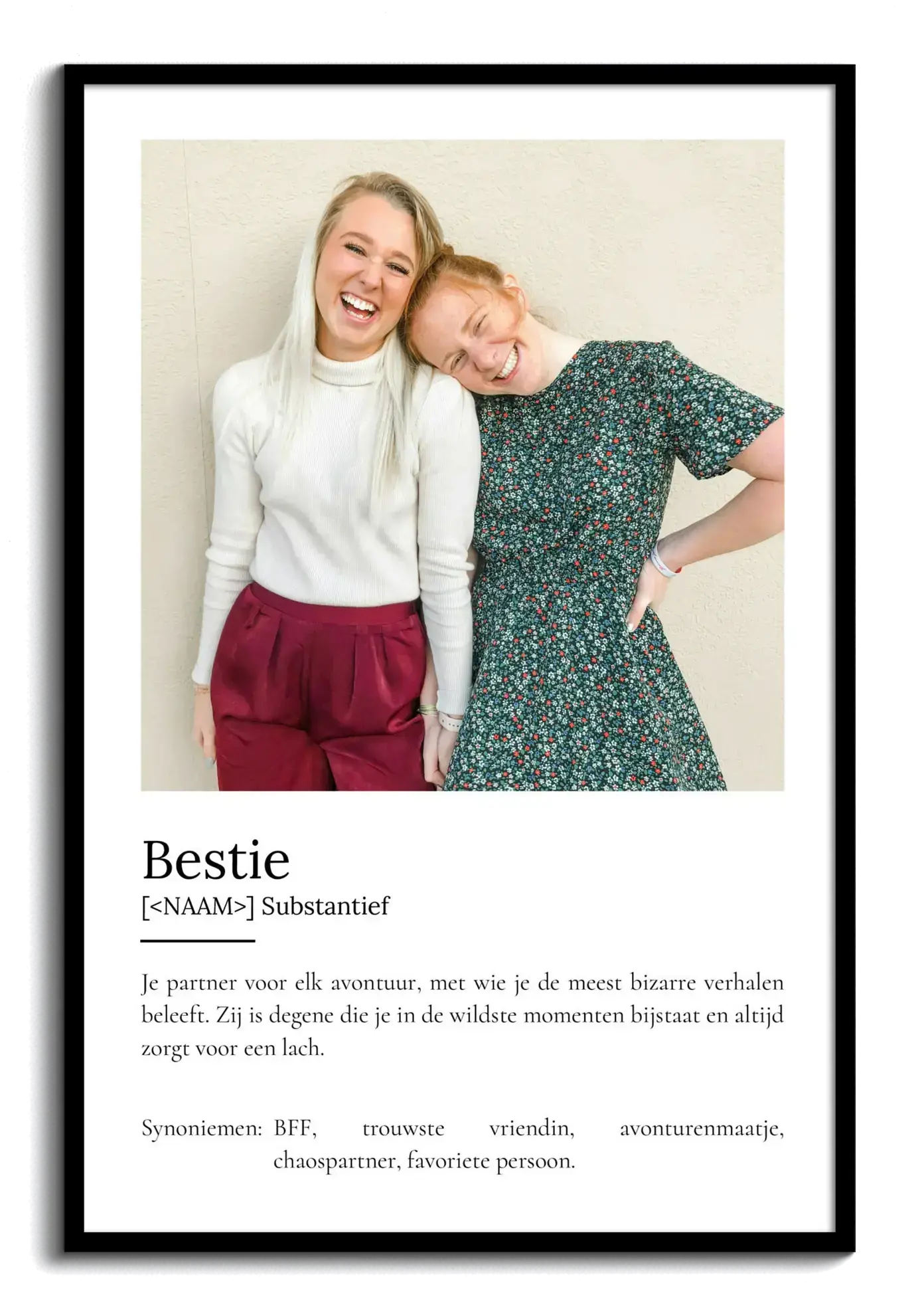 Hier is jouw kans om iets bijzonders te creëren voor je beste vriendin. Het Definition-Poster ‘Bestie’ in Duden-stijl is een perfect geschenk dat haar speciale rol in jouw leven viert. Voeg een of meerdere foto's toe en personaliseer de beschrijving om die unieke band tussen jullie twee te benadrukken.