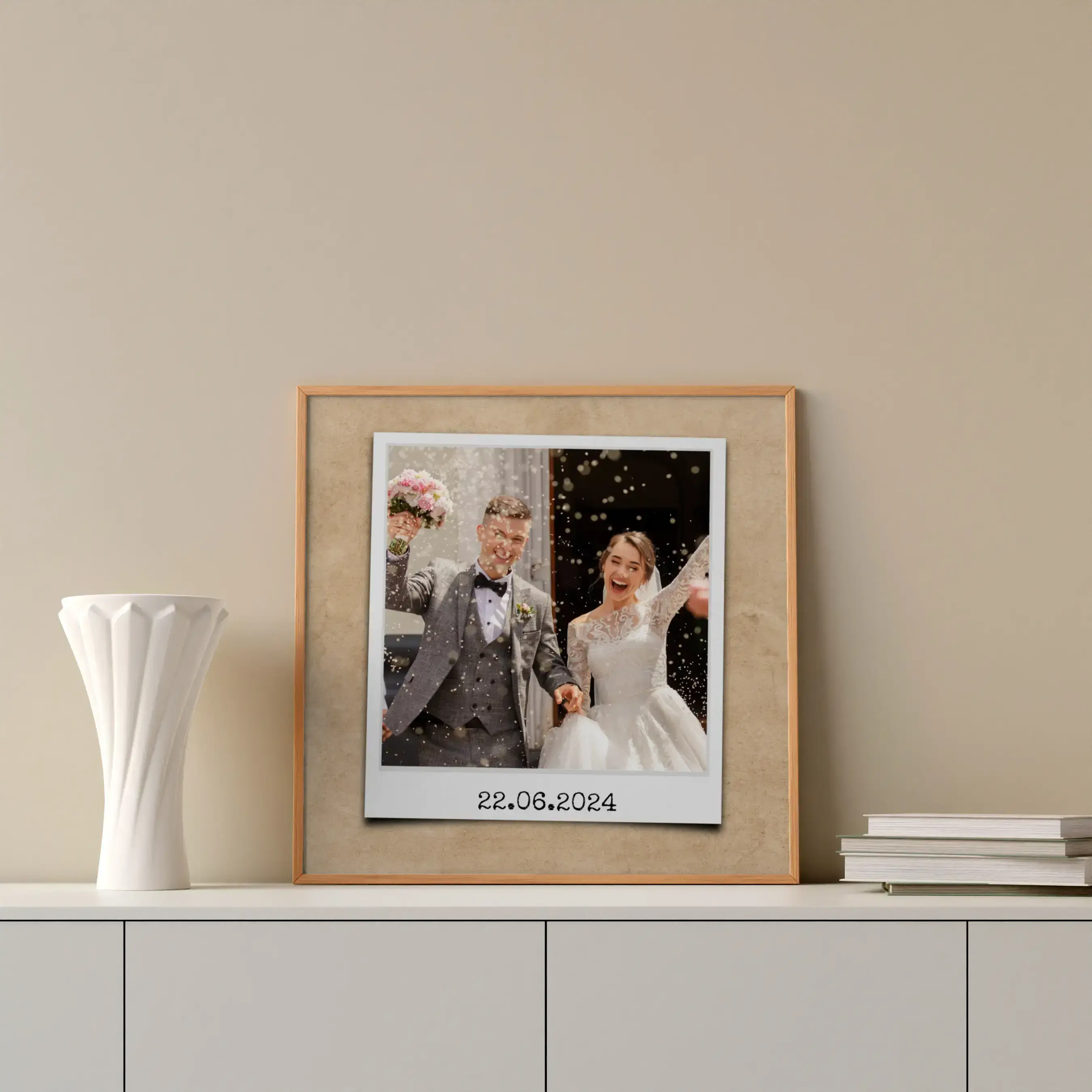 Elegant trouwherinnering in Polaroid-stijl: personaliseer met datum en tekst voor een uniek cadeau.