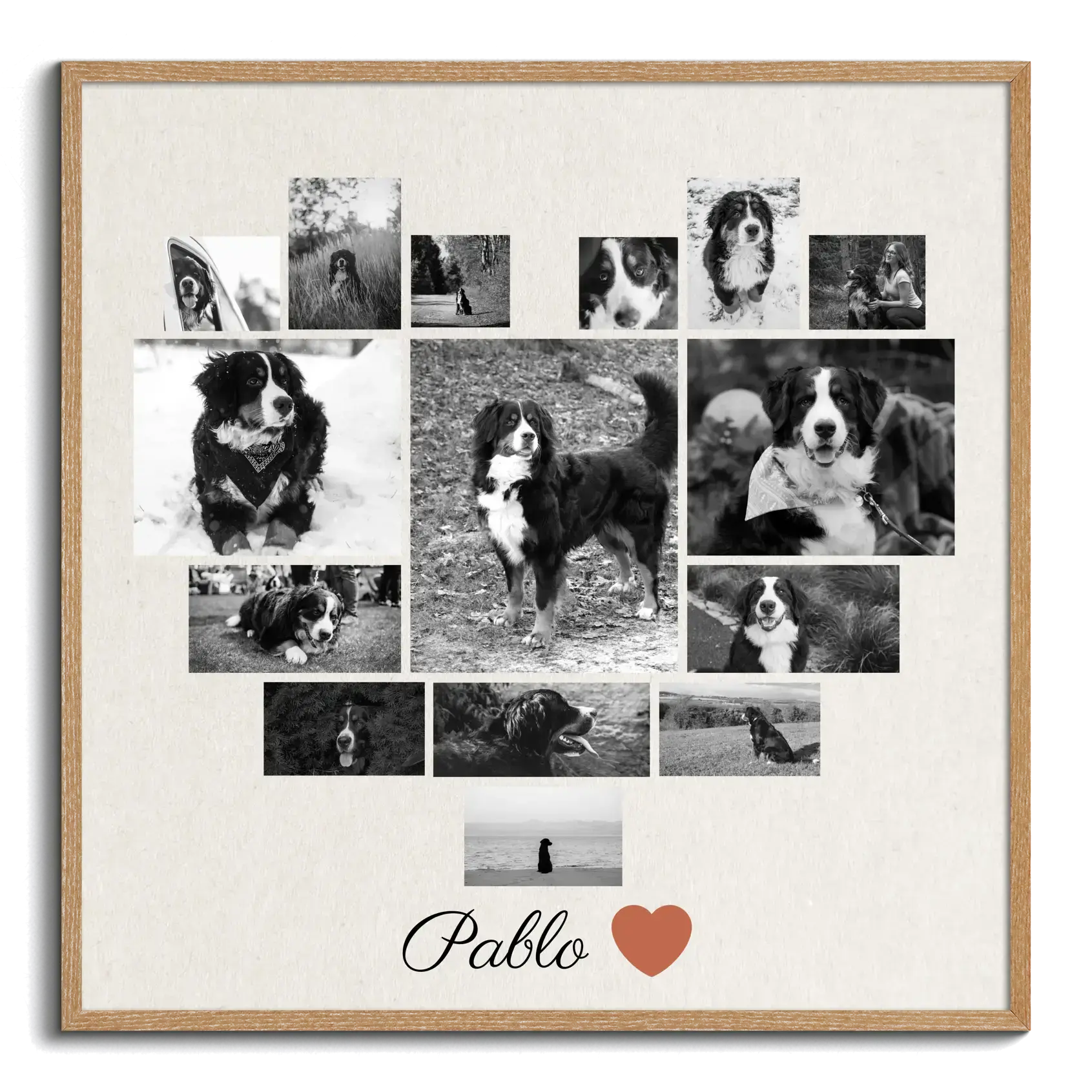 Eervol aandenken aan een geliefde hond: collage met één foto, naam, data en eigen tekst.