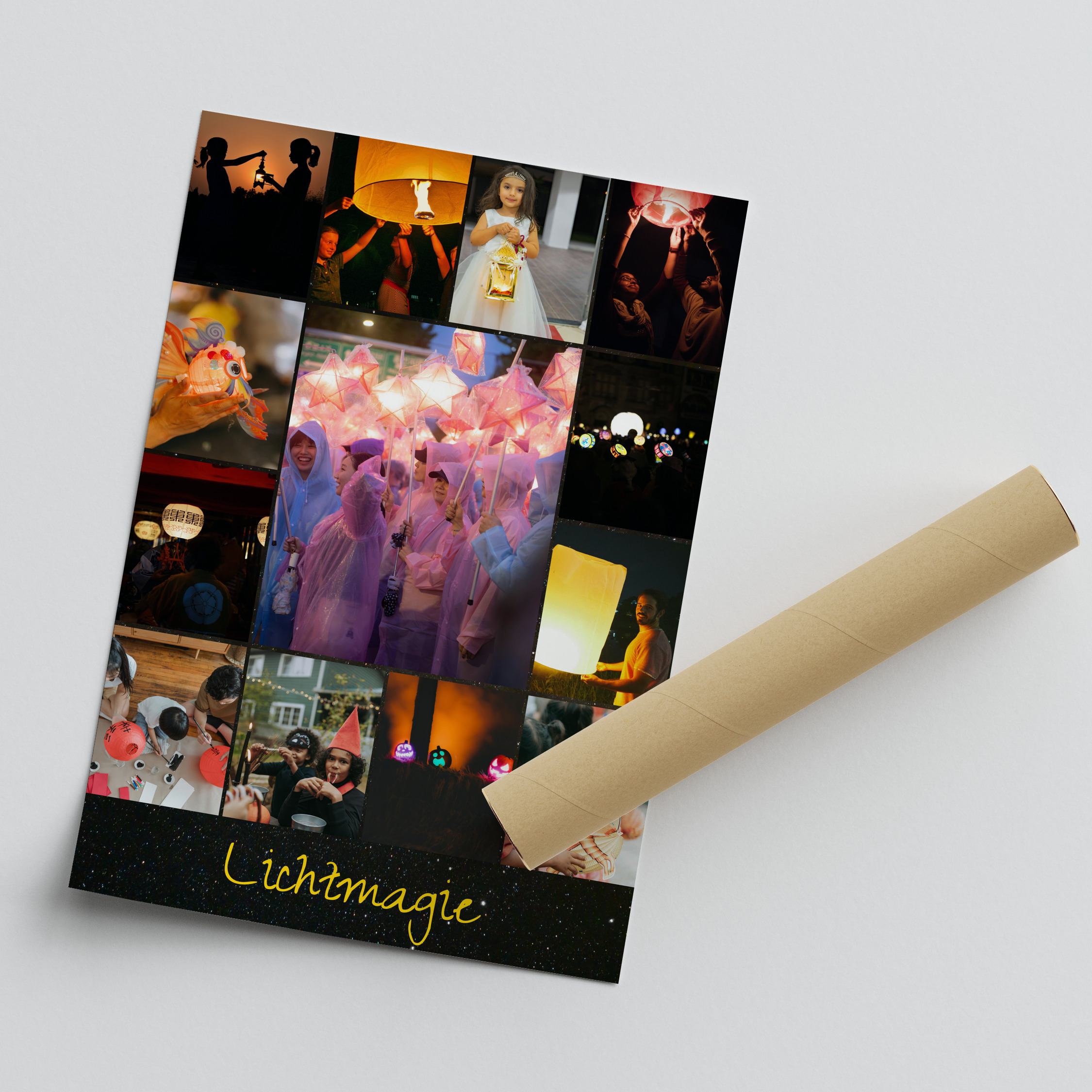 Bestel nu jouw seizoensposter: herfst, lampions en Sint-Maarten in één warm ontwerp. Een vrolijke lampionoptocht met kinderen en volwassenen, grote en kleine, kleurrijke lampions, verwerkt in diverse layouts. Personaliseer met een eigen titel, bijvoorbeeld Lichterzauber of Herfstmomenten.