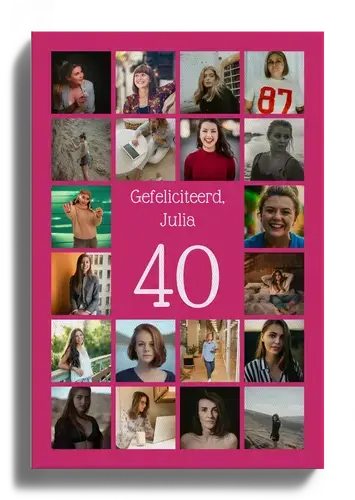 Ontwerp nu jouw 40-jaar cijfercollage. Centraal staat een grote 40, met daarboven een naam en eronder een korte groet, omlijst door 20–80 foto’s in een strak raster. Cijfer, naam, tekst, kleuren, achtergrond en staand of liggend formaat pas je in enkele klikken aan.