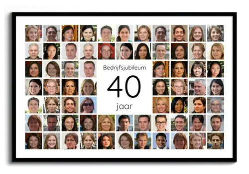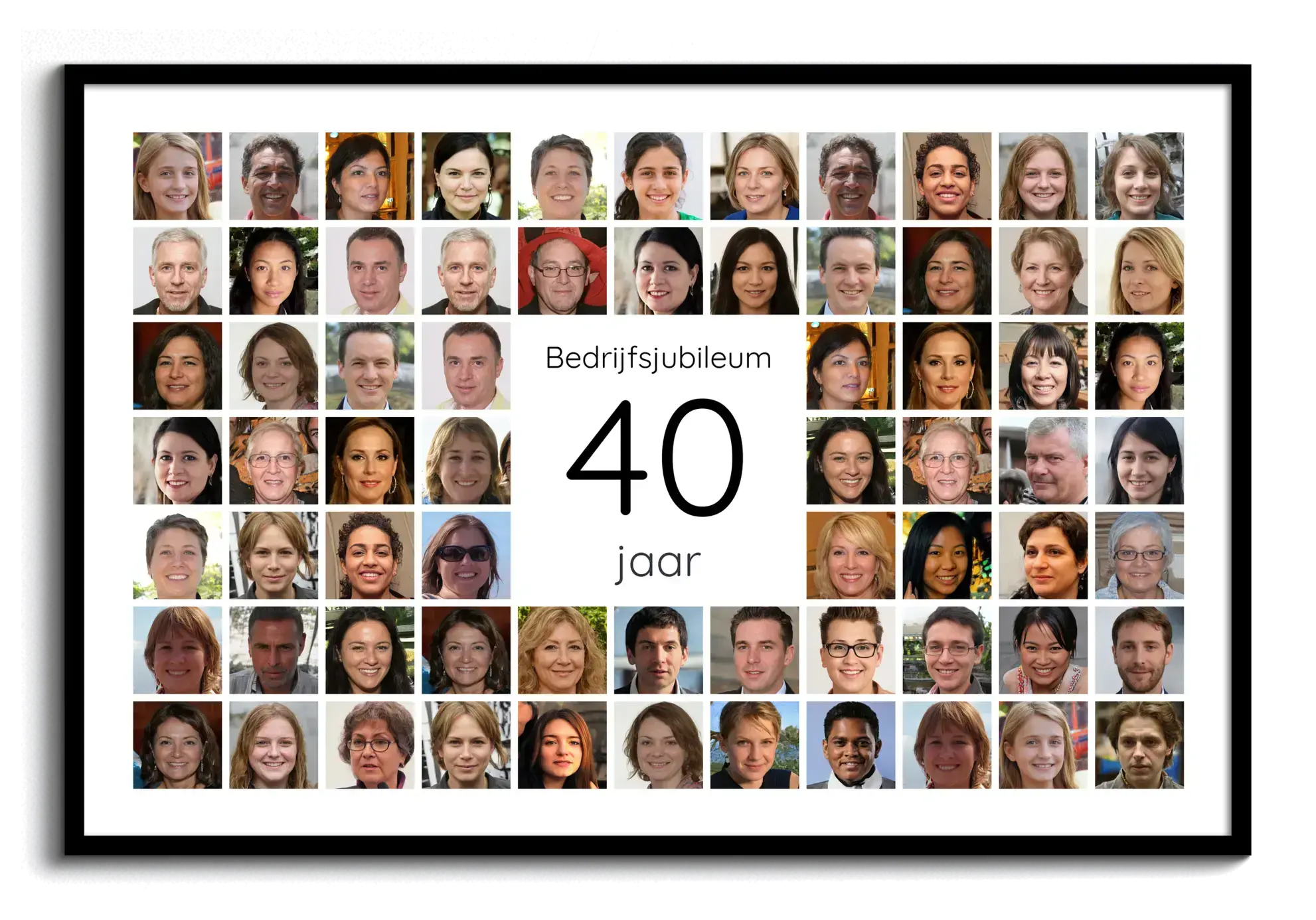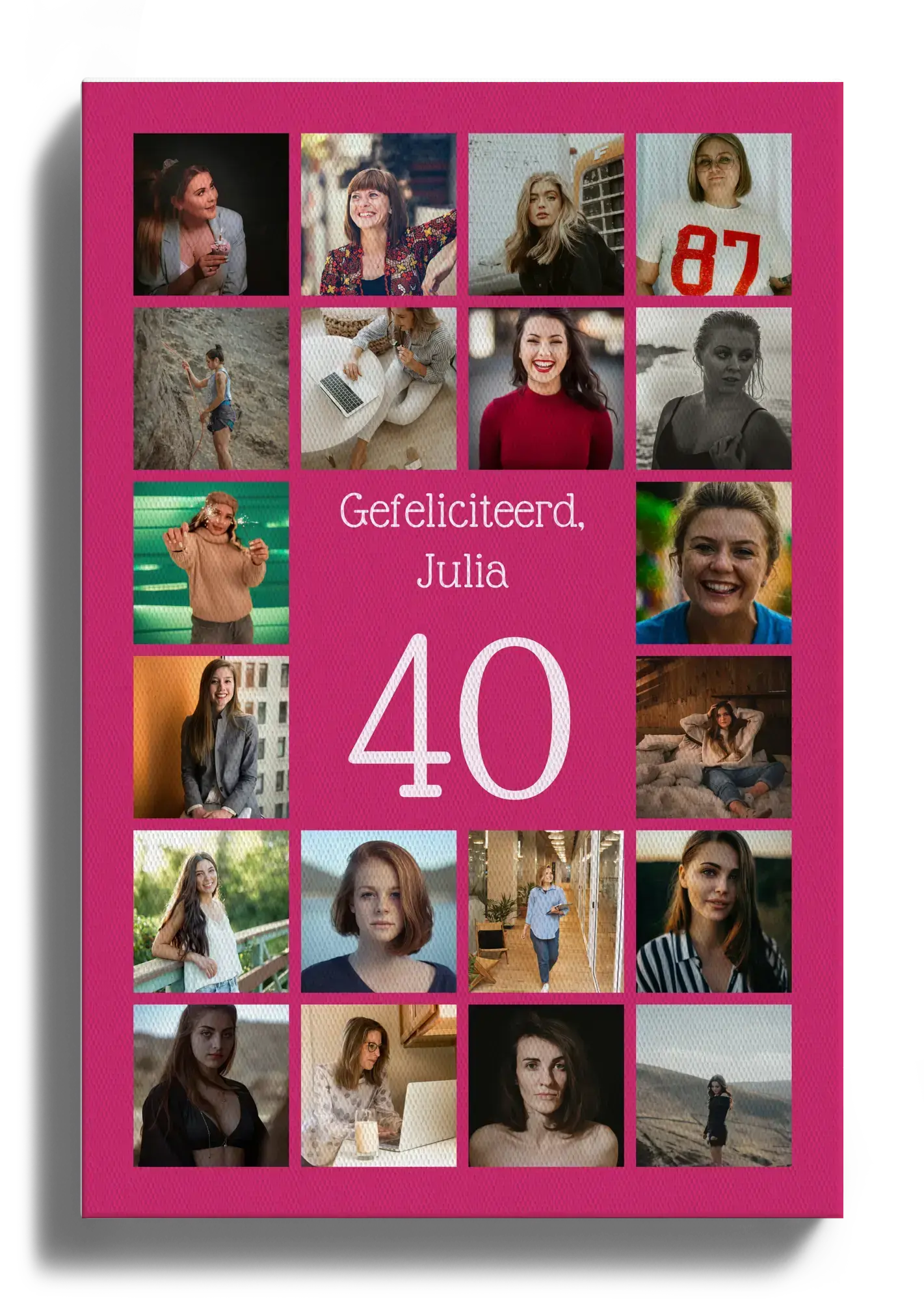 Collage 40: grote 40 met naam, groet en 20–80 foto’s; voor 40 jaar huwelijk, verjaardag, jubileum