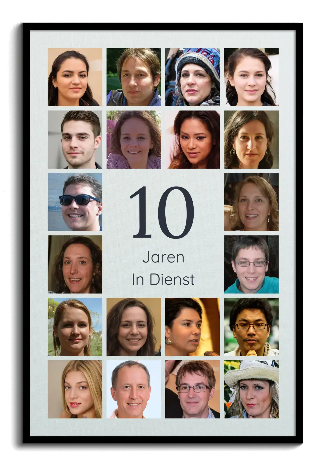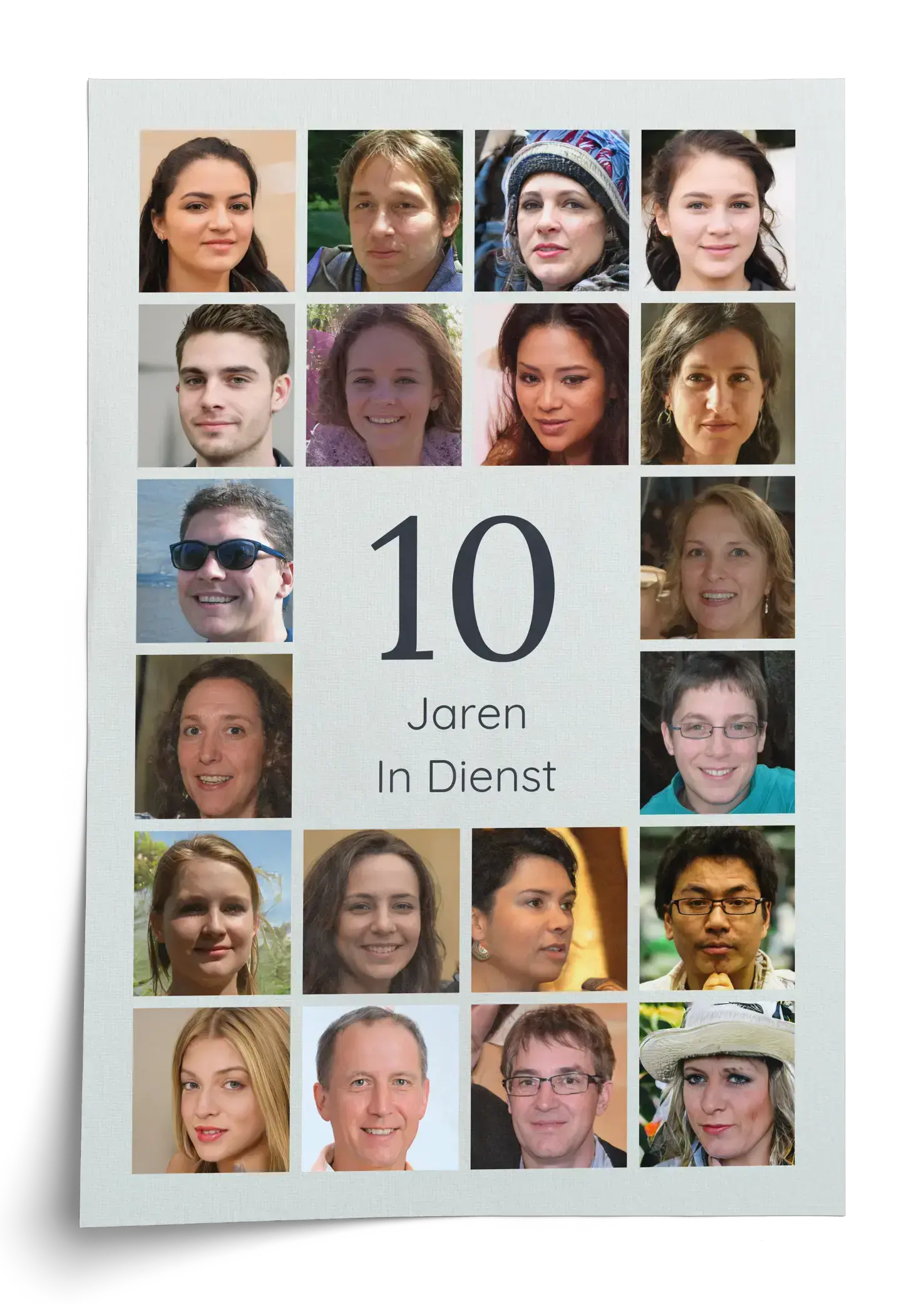 Jubileumcollage 10 jaar: grote 10, naam en groet, 20–80 foto's. Voor werk, huwelijk of vriendschap.