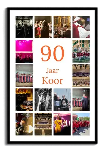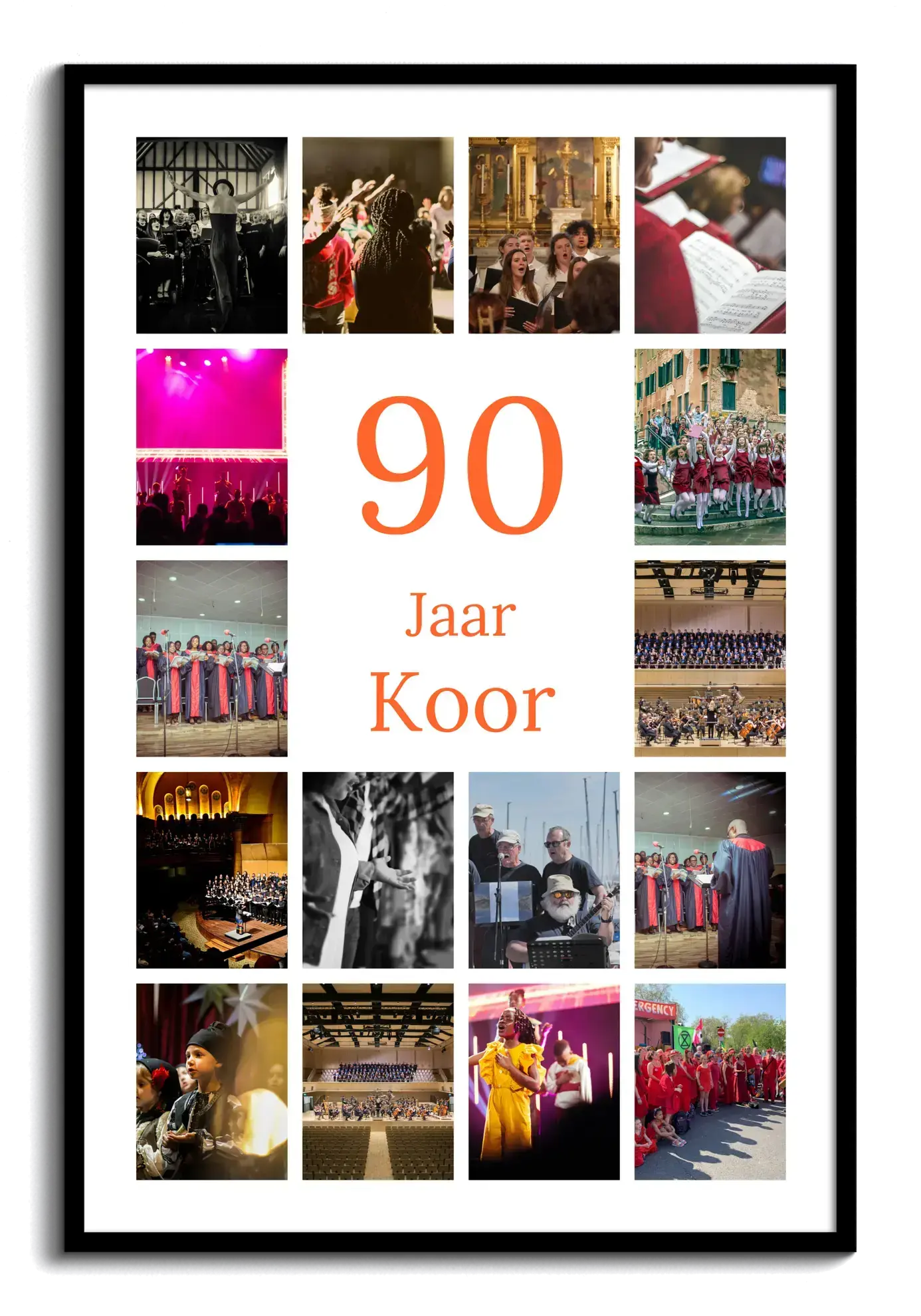Maak nu je eigen jubileumcollage: de getal-collage 90 zet een grote 90 centraal, met daarboven een naam en eronder een korte groet, omringd door 20–80 foto’s in een strak raster. Jij kiest het getal, de naam, de tekst, het aantal beelden, de achtergrond en kleuren, in staand of liggend formaat.