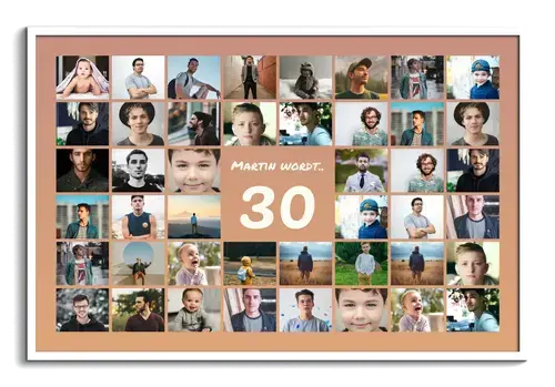 Begin nu met je jubileum-getallencollage 30. In het midden staat een grote 30, erboven een naam en eronder een groet. Daaromheen 20–80 foto’s in een strak raster. Pas getal, naam, tekst, aantal foto’s, achtergrond, kleuren en staand of liggend formaat in een handomdraai aan.