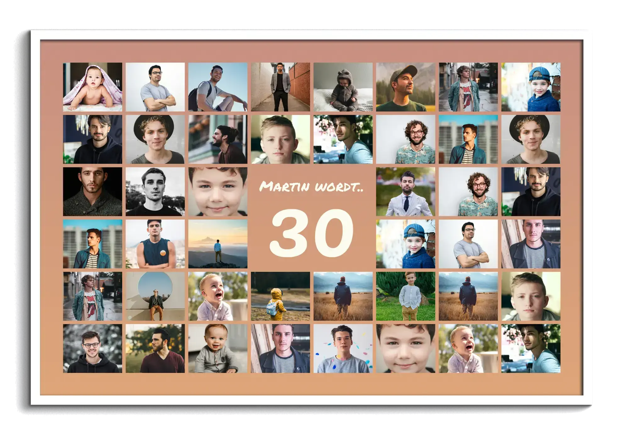 Collage 30: grote 30 met 20–80 foto's; perfect voor 30e verjaardag, trouwdag of dienstjubileum.