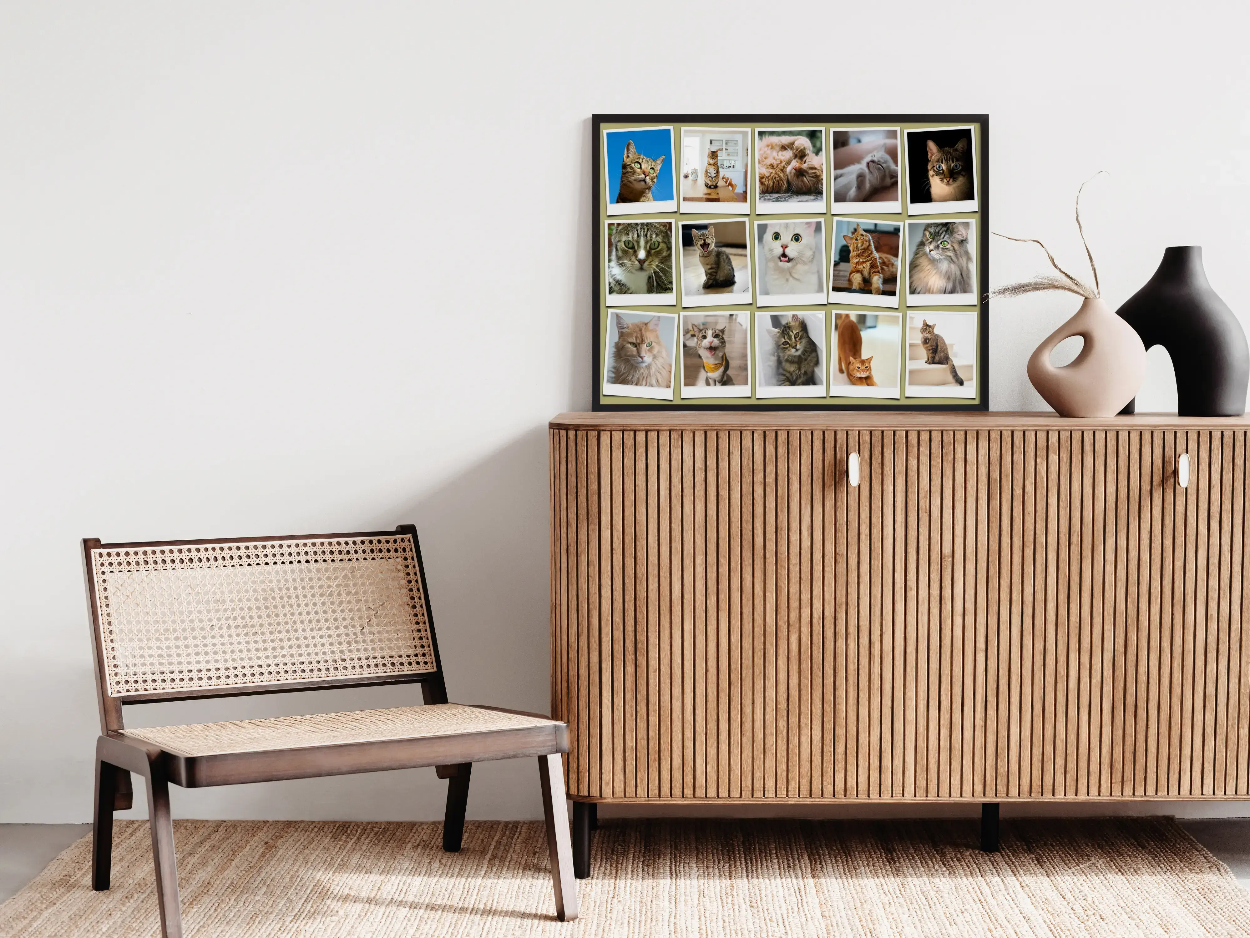 Begin nu en maak je eigen katten-collage. Kies de Polaroid-sjabloon en vul ‘m met je liefste kattenfoto’s. Zet er je eigen tekst onder, zoals Floris de kater of simpelweg de naam. Pas rand, volgorde en kleur aan tot het geheel klopt met jouw stijl en hang ‘m straks trots aan de muur.