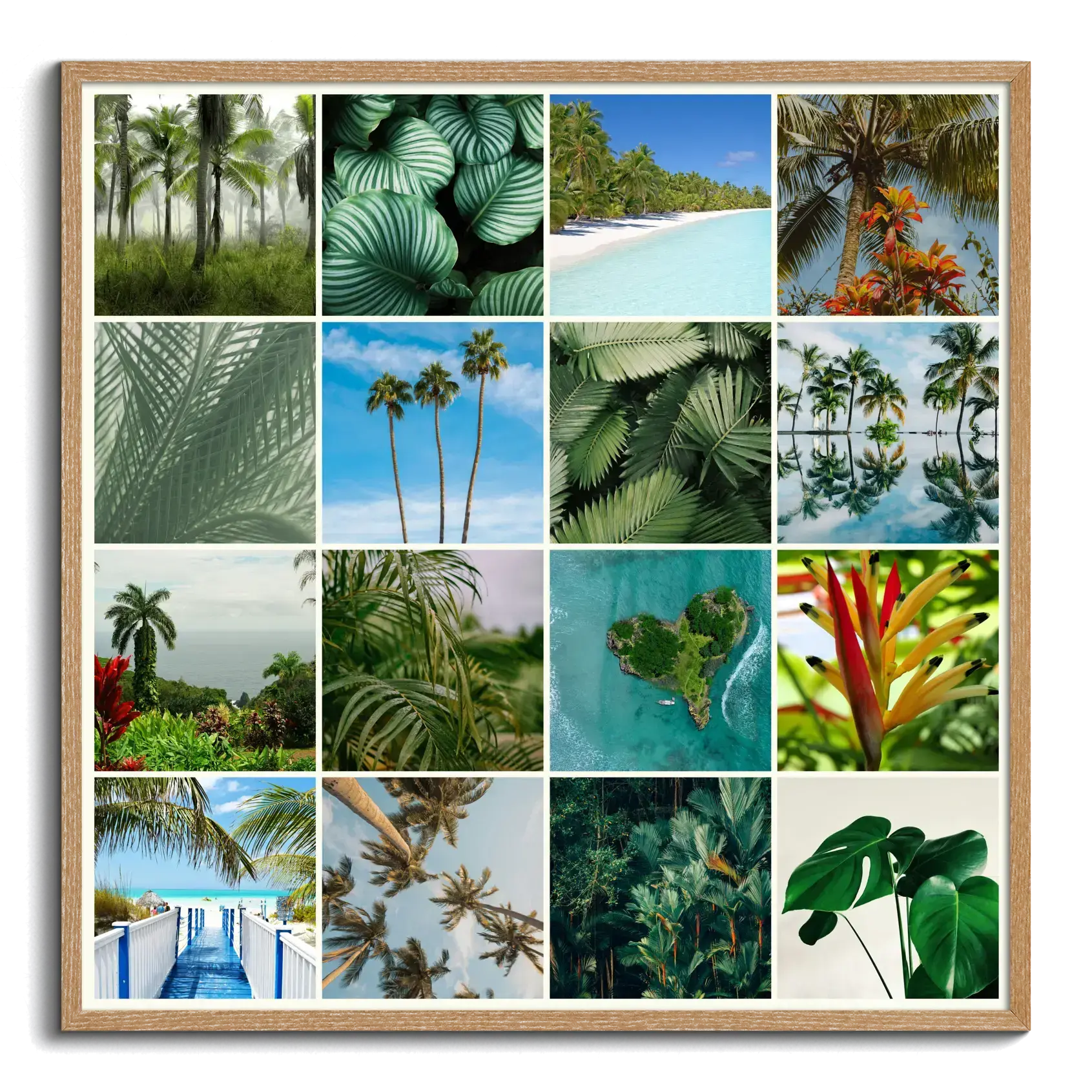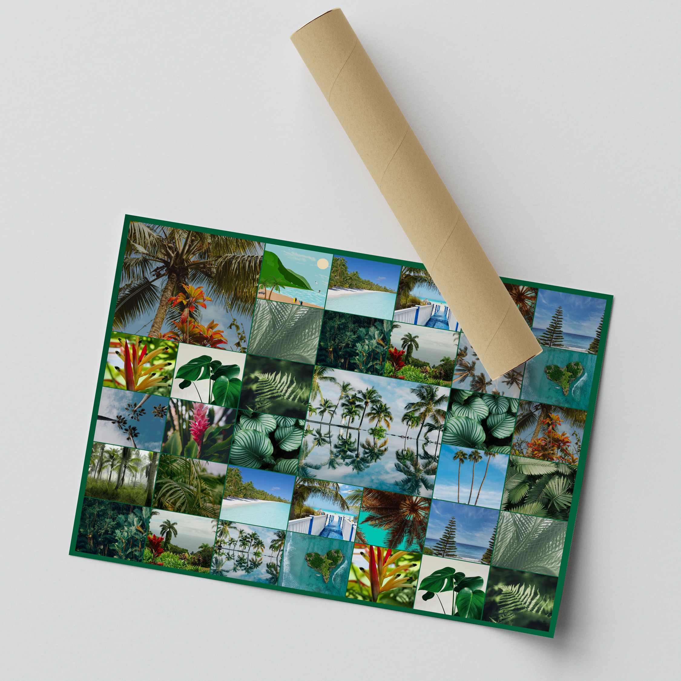 Natuurfoto's in premiumdruk: collages met tropische planten, palmen, regenwoud en strand.