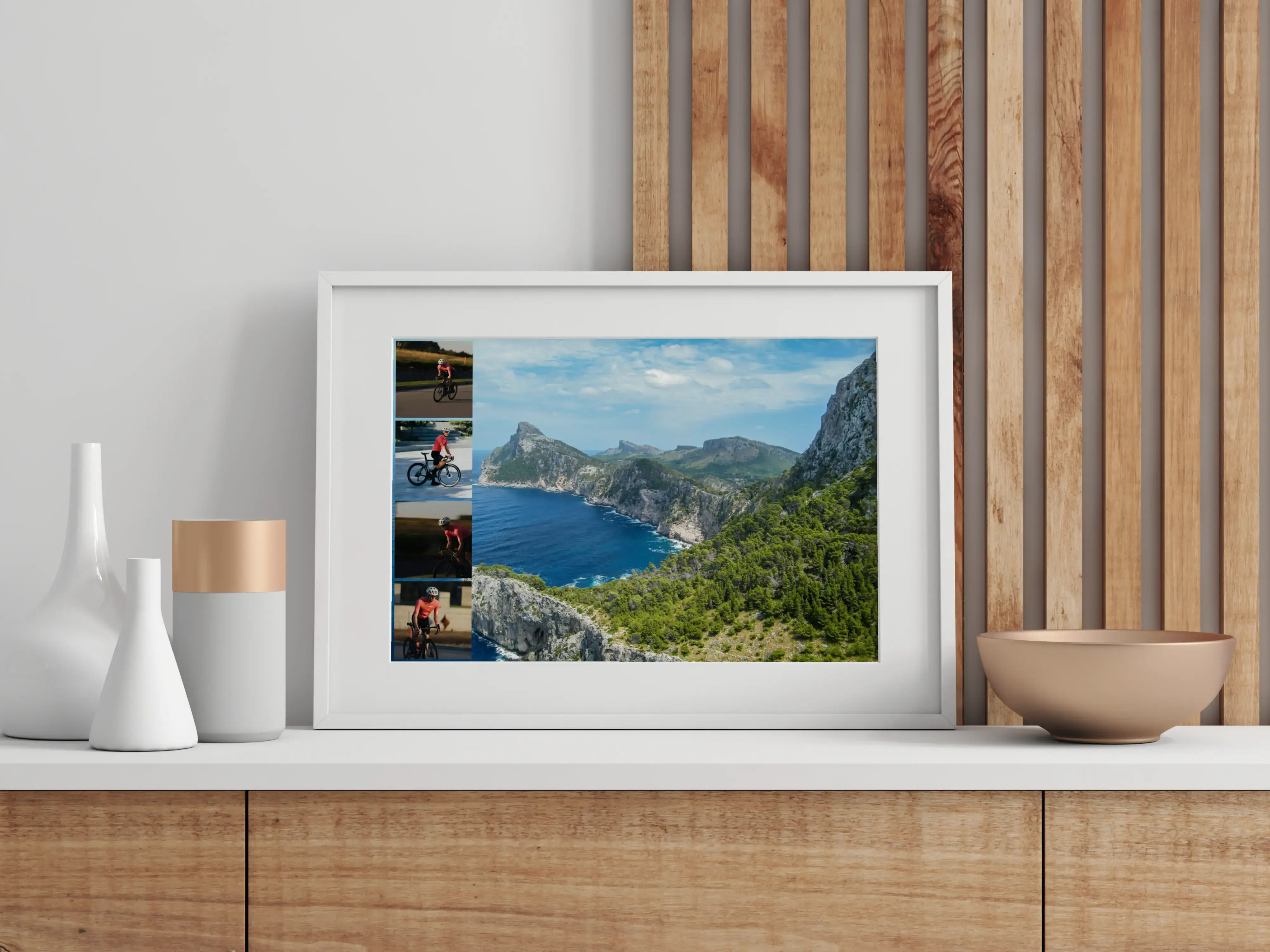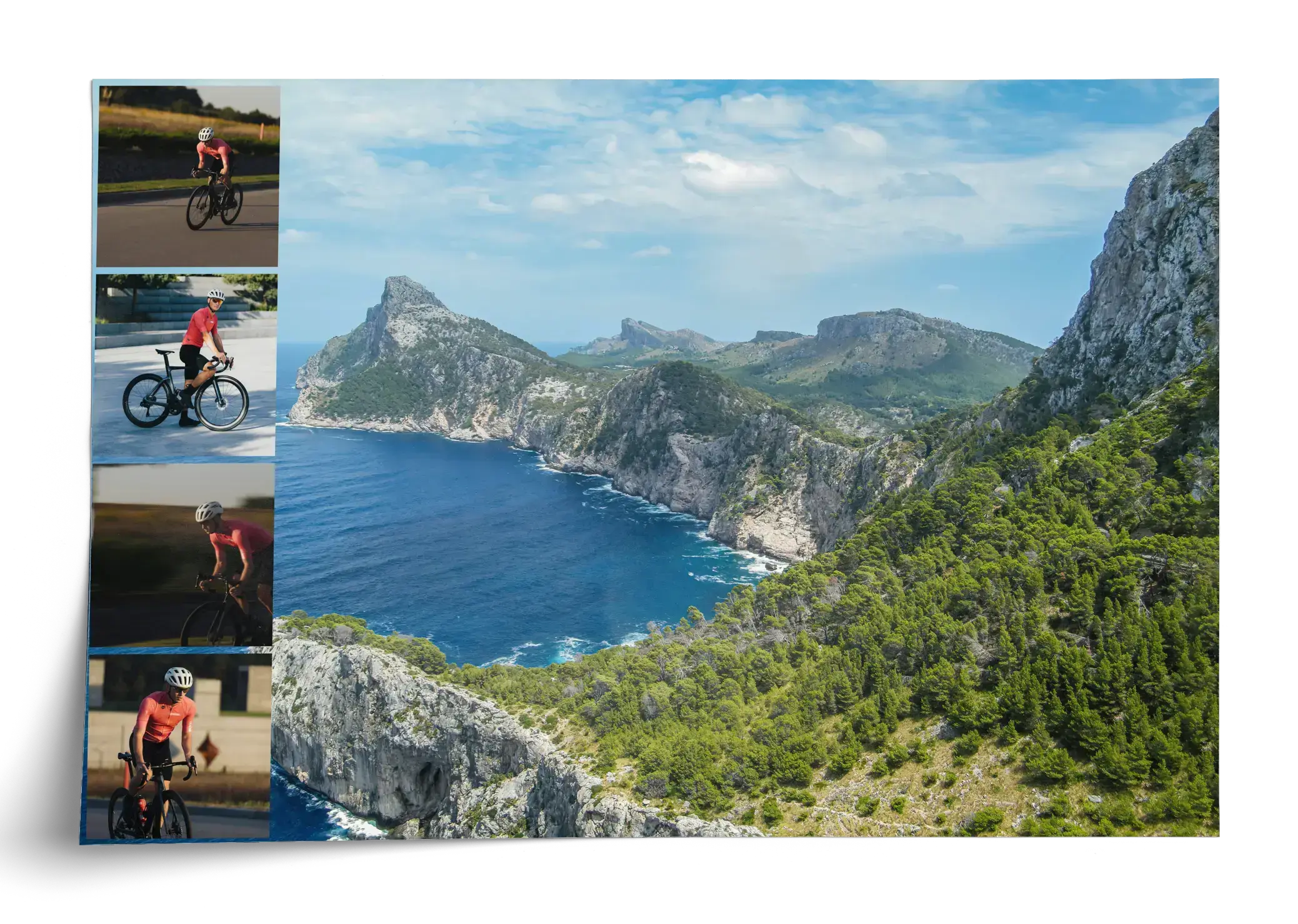 Je hebt veel vrijheid in het ontwerp. De grootte is aanpasbaar, net als het aantal beelden dat je gebruikt. Je kunt teksten toevoegen, bijvoorbeeld een plaatsnaam, datum, teamnaam of de titel van een rit. Ook achtergrondkleur, beelduitsnede en compositie zijn flexibel, zodat de collage rustig, sportief of juist opvallend kan ogen.