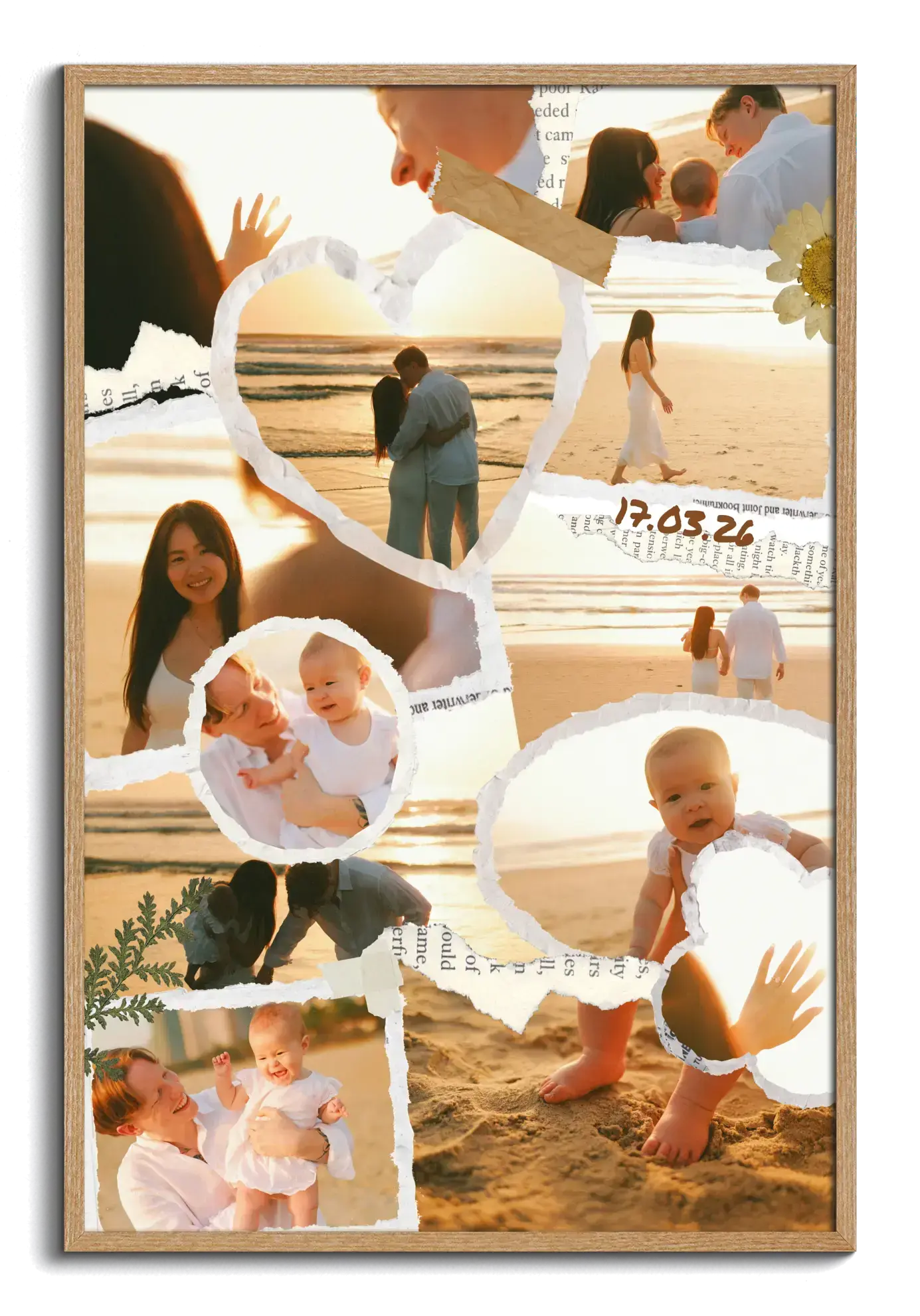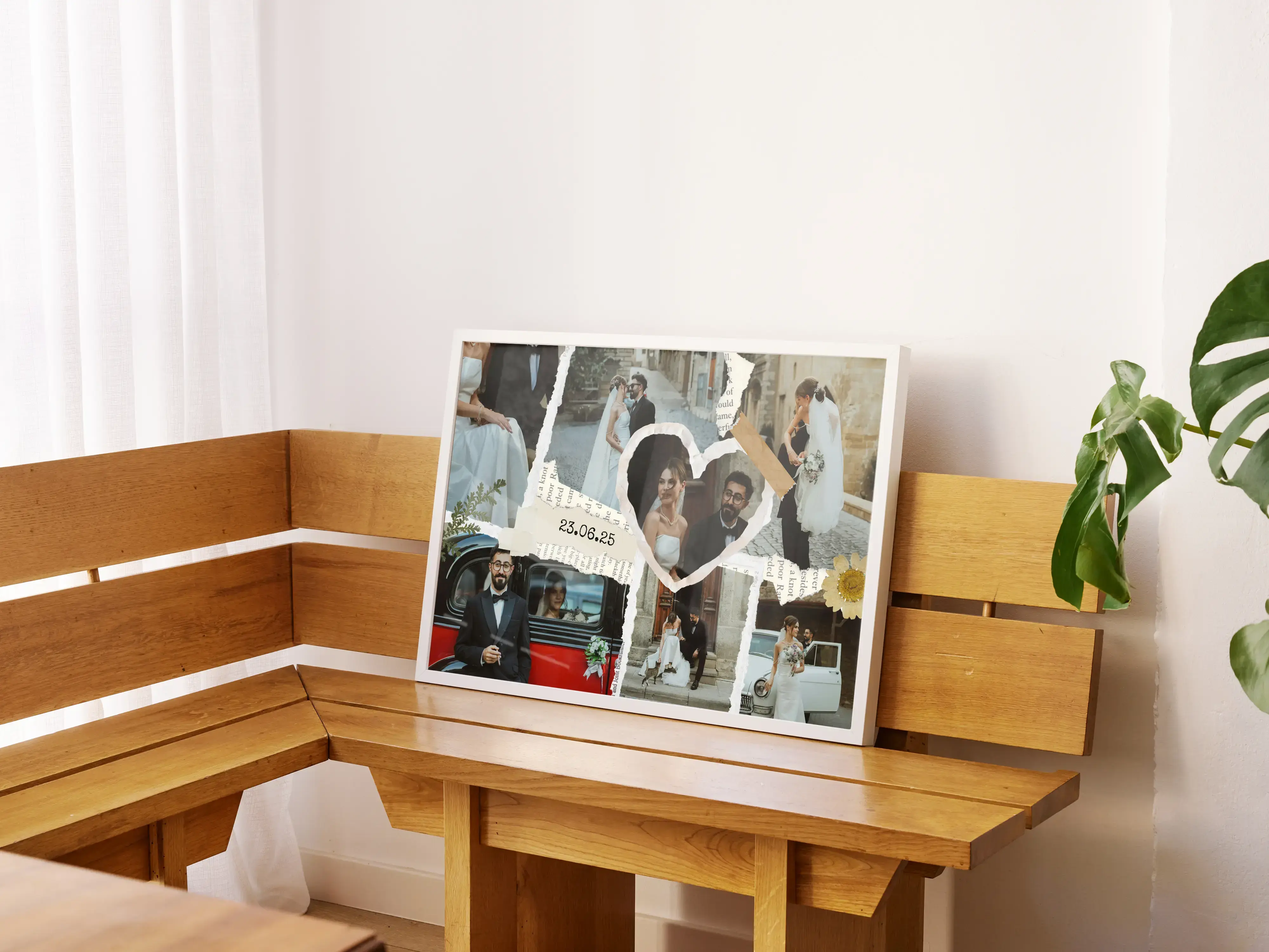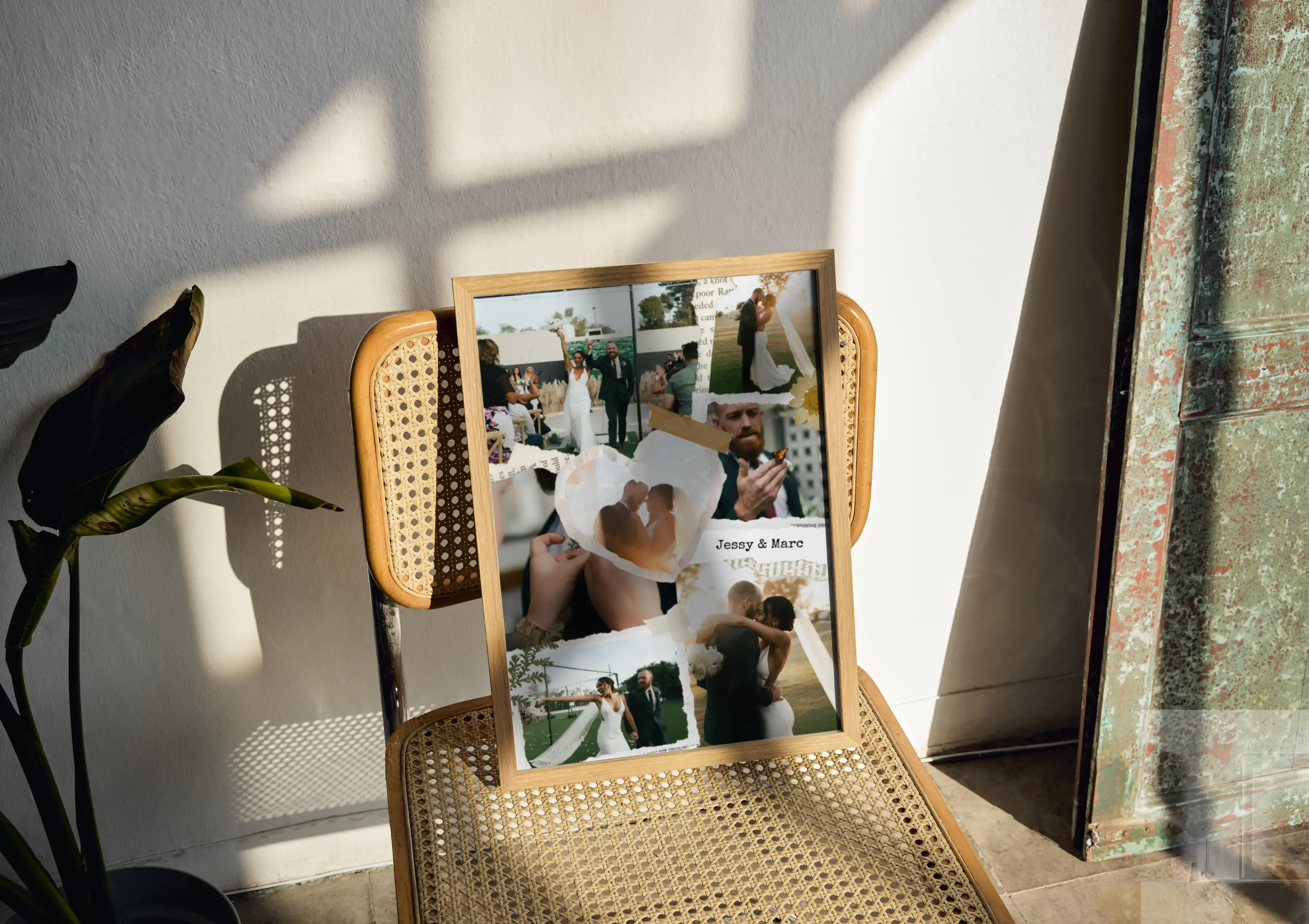 Deze scrapbook-collage past prachtig bij een huwelijk, verloving of jubileum, maar is ook een mooi cadeau voor ouders, getuigen of beste vrienden. Denk aan een herinnering aan de trouwdag, een origineel verlovingscadeau of een persoonlijk decoratiestuk voor het feest, thuis of op kantoor.