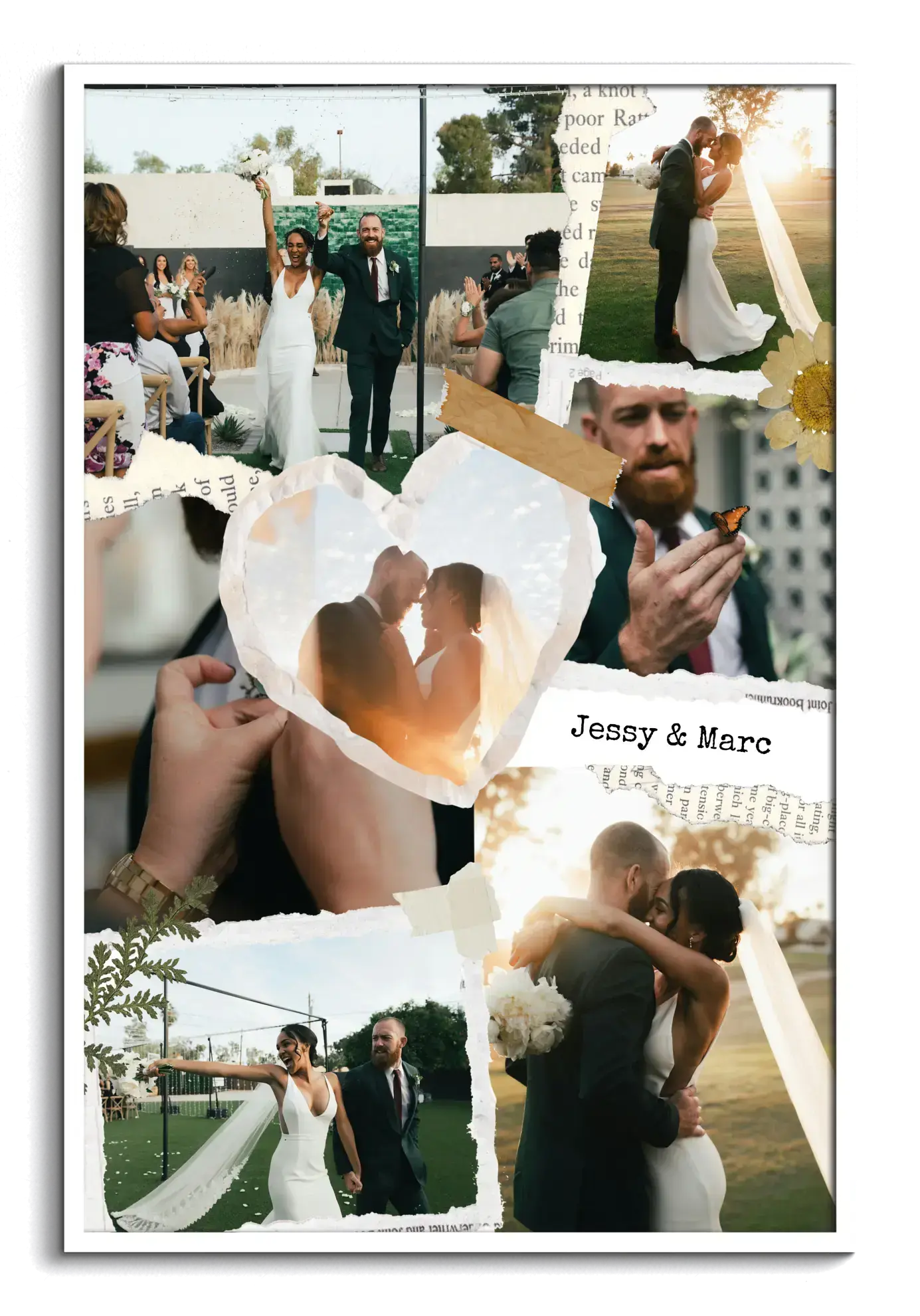 Maak nu jouw persoonlijke scrapbook-collage voor een huwelijk of verloving. Meerdere foto’s worden speels gecombineerd alsof ze uit papier zijn geknipt, met tape-details en kleine versieringen. Namen, datum of een korte handgeschreven tekst maken het ontwerp extra persoonlijk, in staand of liggend formaat.
