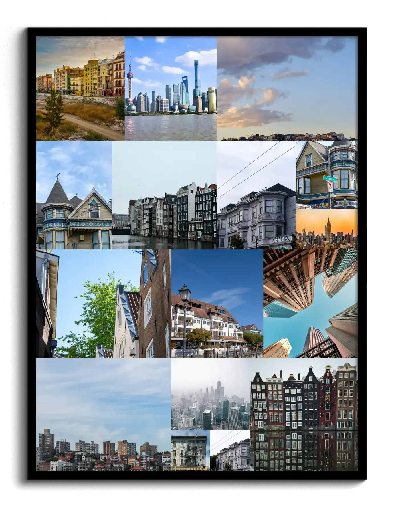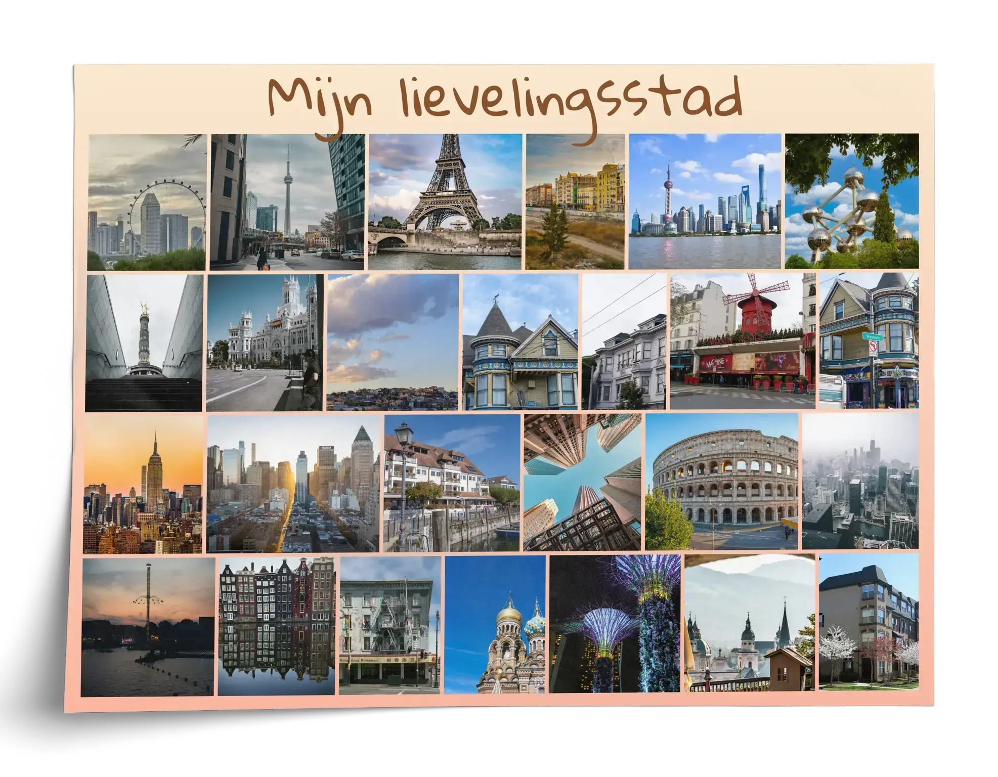 Start nu en bestel direct. Vang je vakantiesfeer aan de muur: bundel foto’s van steden en bezienswaardigheden uit verschillende landen in stijlvolle collage-sjablonen. Kies raster, hart of tekstvorm en voeg je eigen titel toe, bijvoorbeeld Mijn lievelingsstad. Perfect voor highlights uit Rome, Parijs, Lissabon en meer in één print.