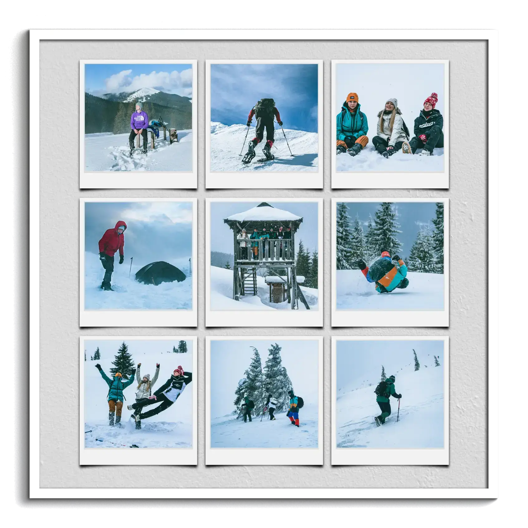Ontwerp je eigen unieke winterherinneringen met onze gepersonaliseerde fotocollages! Laat al je prachtige landschappen en familiefoto's tijdens de wintervakantie stralen. Of je nu op de skipiste bent of gewoon van de sneeuw geniet, leg deze momenten vast in een collage. Voeg een persoonlijke touch toe met teksten zoals "Onze Wintervakantie" en maak het helemaal eigen.